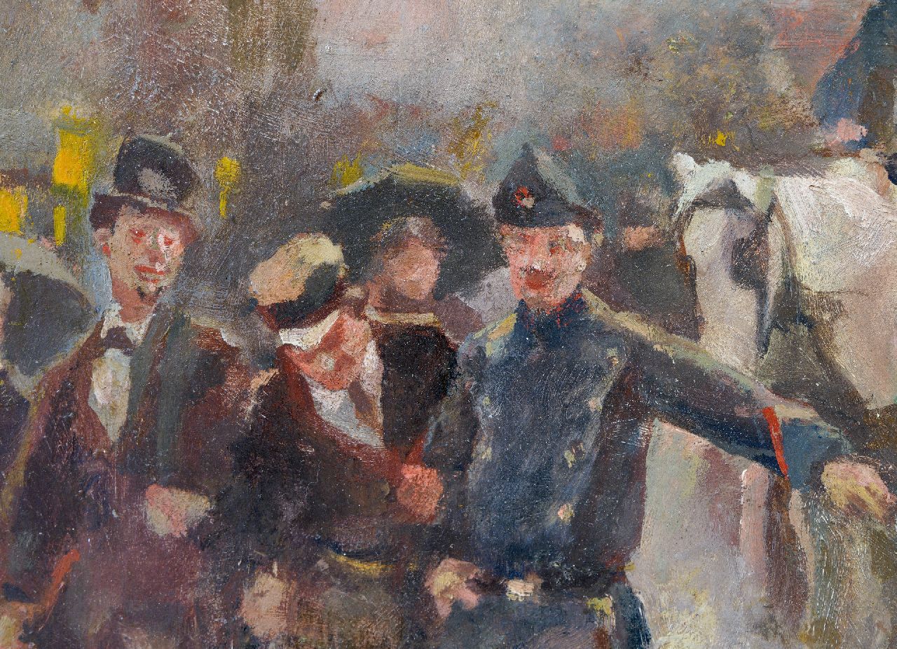 Adriaan de la Rivière schilderde tussen ongeveer 1880 en 1940 sterk verhalende genrestukken van het alledaagse leven in de stad en op het platteland in een lichtvoetige, impressionistische stijl. Zijn oeuvre omvat stadsgezichten met veel figuren, herbergscènes, marktstallen met verkopers van allerlei aard, boeren aan het werk op het land en parkscènes. De schilder werd opgeleid aan de academie van Rotterdam en studeerde met een beurs in München. Tussen 1894 en 1896 was hij bestuurslid van de Kunstkring Rotterdam.