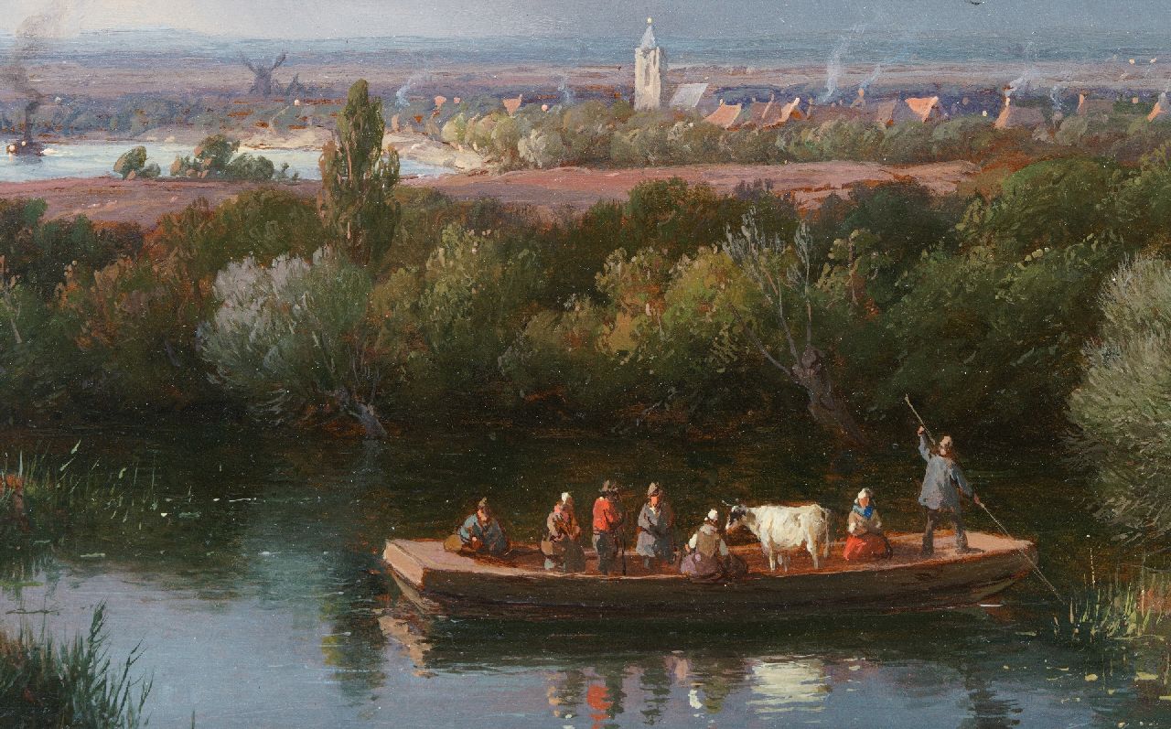 Andreas Schelfhout kunstwerk • schilderij • te koop Panoramisch zomerlandschap met overzetveer