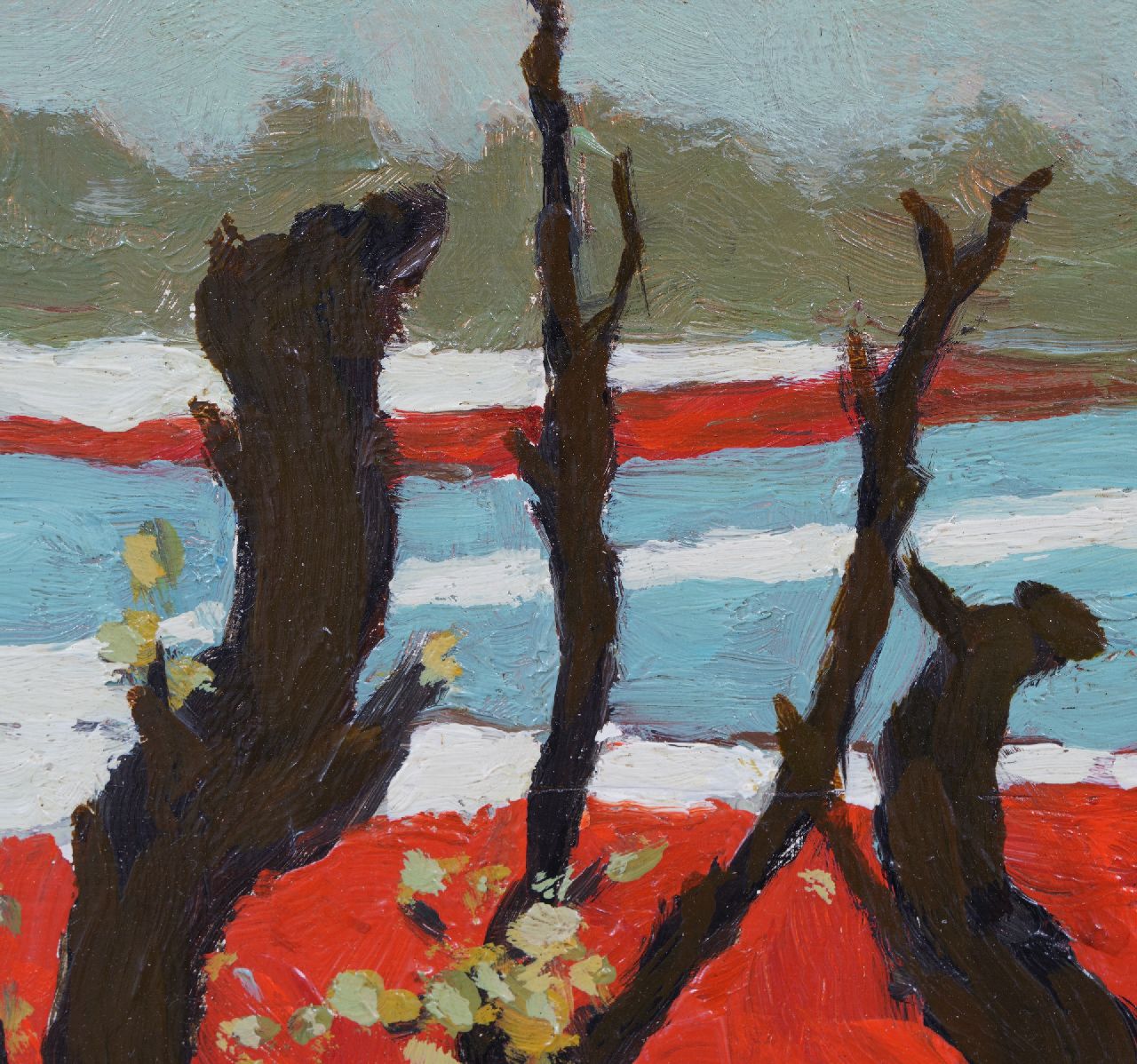 Dit werk doet Japans aan door het kleurgebruik en het zilverachtige wit van de bladeren. De singels van elzen dienden als windschermen en voorkwamen zo de verspreiding van bollenziekten.