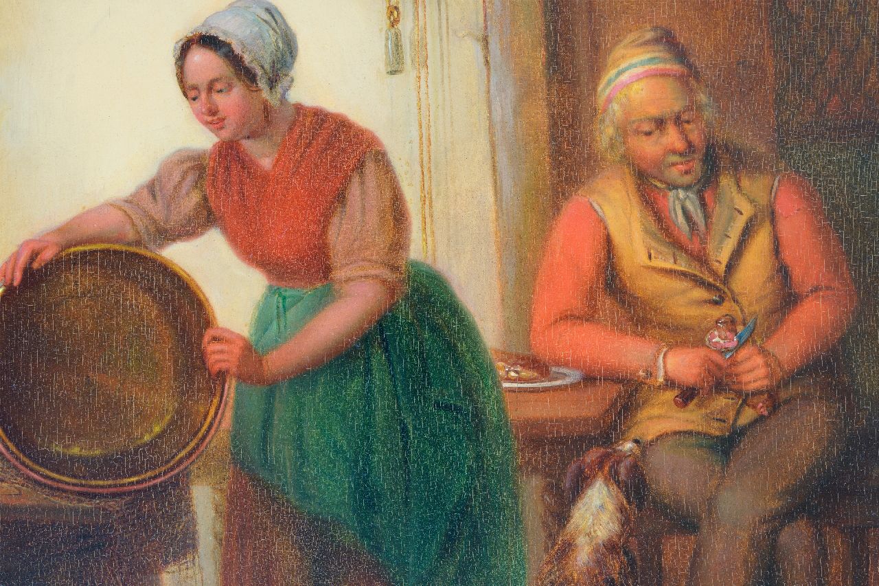 Antoon François Heijligers kunstwerk • schilderij • te koop Keukeninterieur met man en vrouw