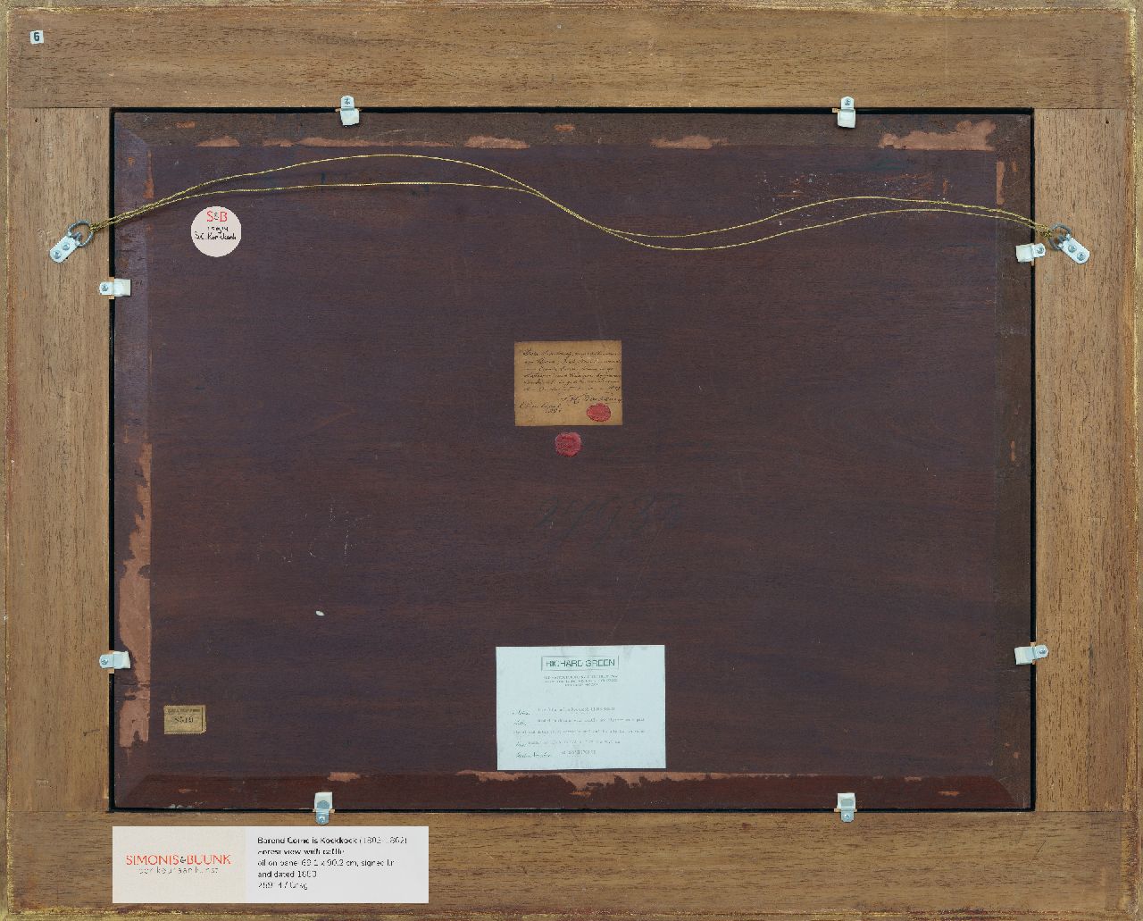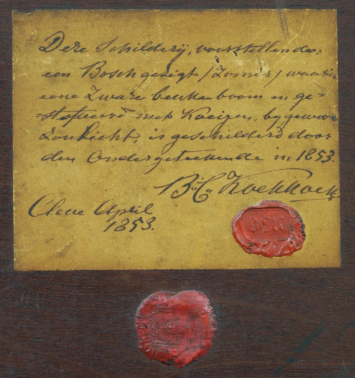 annotatie Met verso authenticiteitsverklaring van de schilder op verzegeld etiket: 'Deze schilderij, voorstellende: een Boschgezigt/Zomer/waarin eene Zware beukenboom en gestoffeerd met Koeijen, bij gewoon zonlicht, is geschilderd door den Ondergeteekende in 1853. B.C. Koekkoek. Cleve April 1853.'