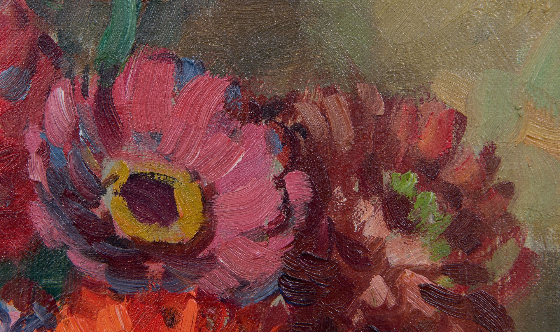 Ben Viegers kunstwerk • schilderij • te koop Zinnia's in een blauwe vaas