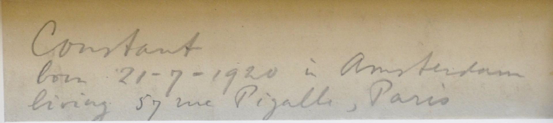 annotatie verso: 'Constant, born 21-7-1920 in Amsterdam living 57 rue Pigalle, Paris price 5000 frs' De signatuur en het handschrift aan achterzijde zijn geautoriseerd door een forensisch schriftkundige als zijnde van Constant.