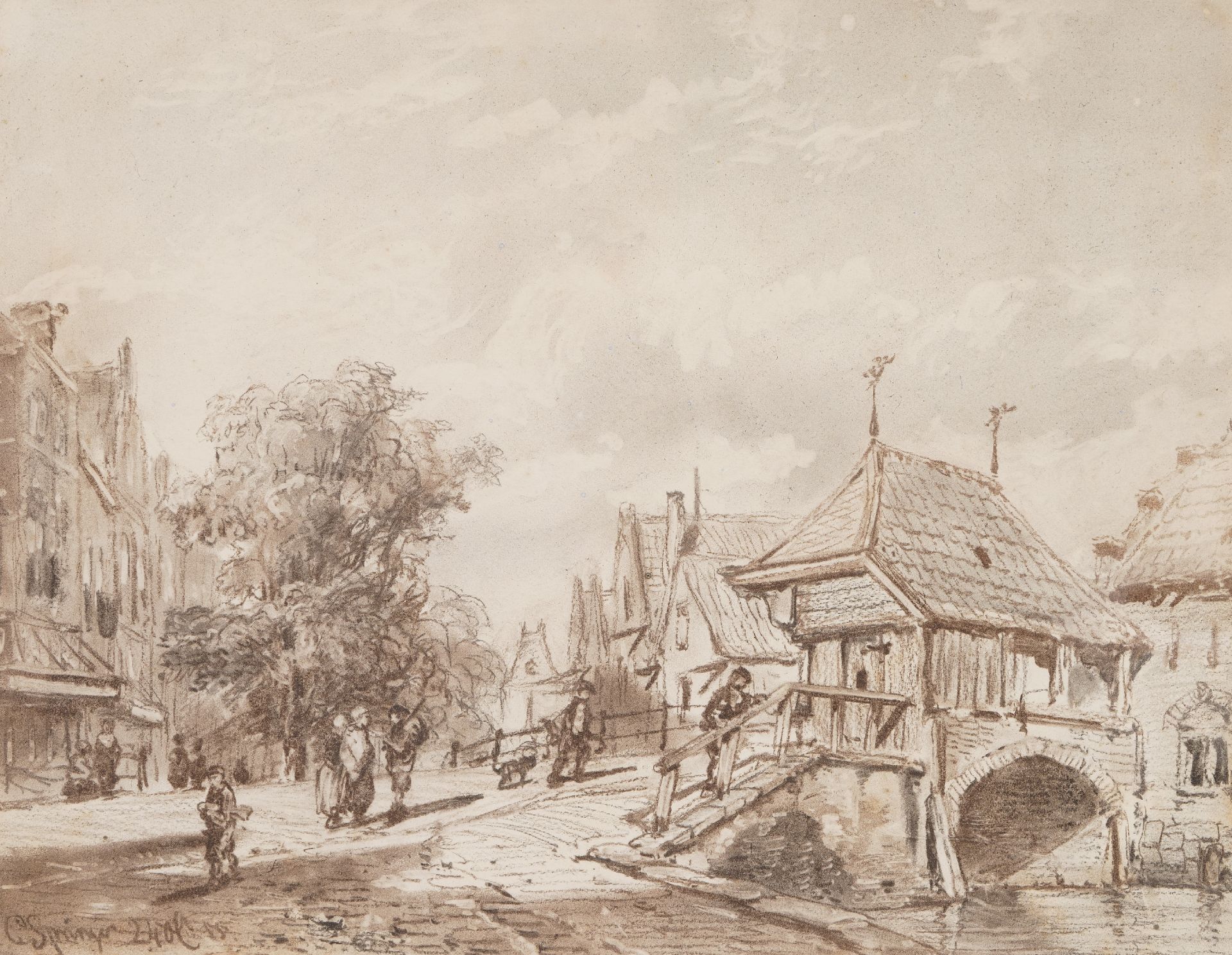 Cornelis Springer kunstwerk • aquarel • tekening • te koop Gezicht op de visafslag en brug in Oudewater