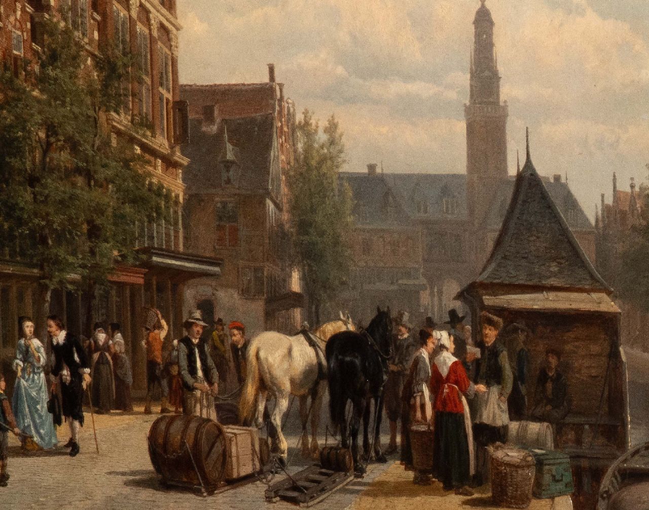 Cornelis Springer | Drukbevolkt marktgezicht voor de Wijnhuistoren in Zutphen, olieverf op paneel, 60,0 x 47,5 cm, gesigneerd m.o. en gedateerd 1872