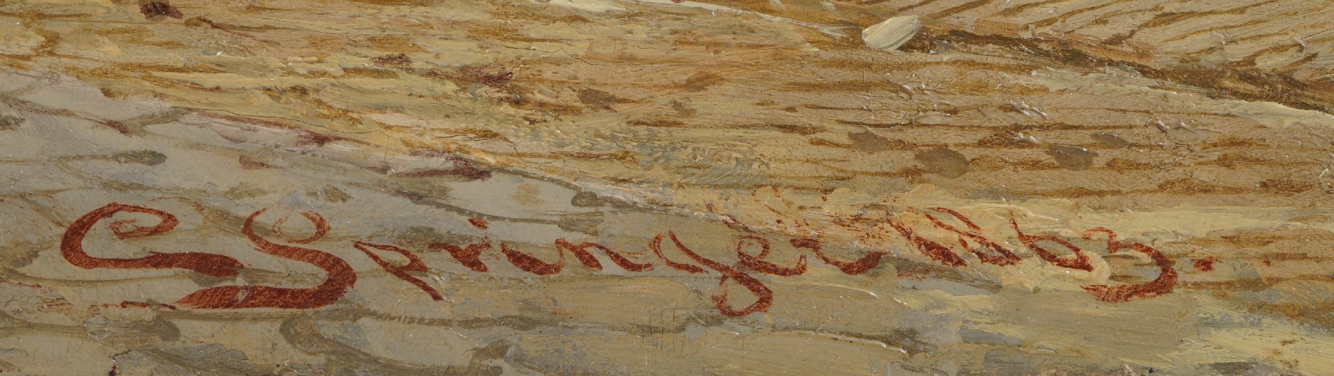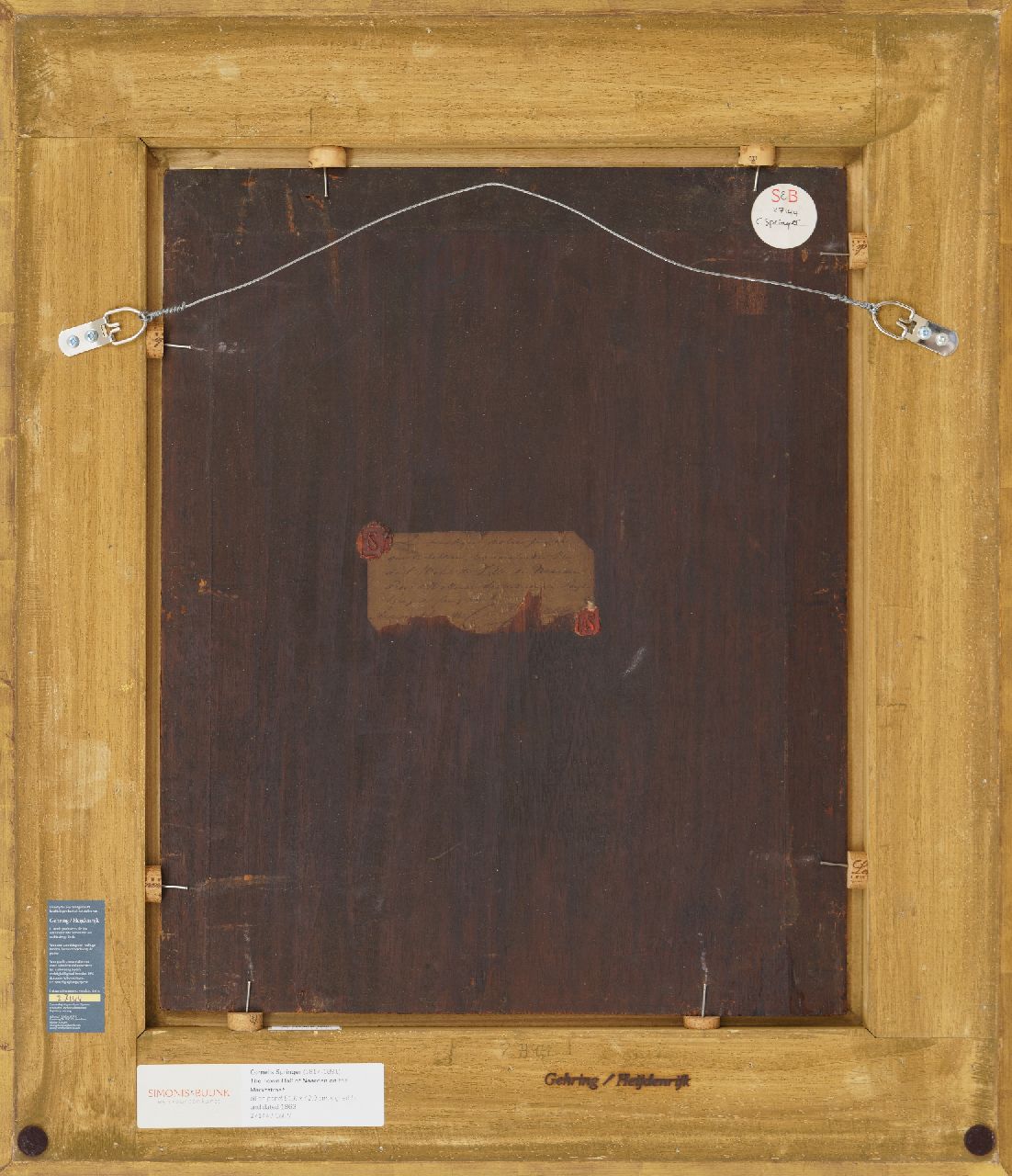 Met verso authenticiteitsverklaring van de schilder op verzegeld etiket: 'Le Soussigné declare par ici que ce tableau, representant Rue de l’Hotel de Ville de Naarden prov. d’Hollande septentrionale Pays Bas, est peint par lui, Amsterdam 1863, C. Springer’’