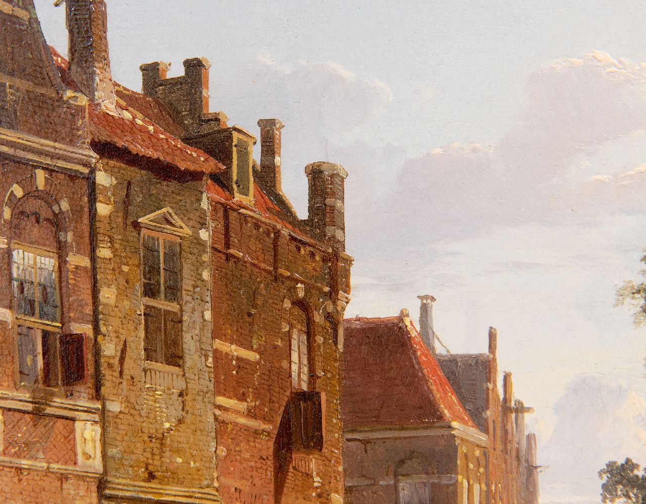 Cornelis Springer schilderde vooral stads- en dorpsgezichten waarin gevels en levendige stoffage baden in een warm zonlicht. Samen met Barend Cornelis Koekkoek en Andreas Schelfhout behoort hij tot de belangrijkste schilders van de Hollandse romantiek. In zijn schilderijen is vaak een prominente plaats toebedeeld aan gebouwen uit de 17e en 18e eeuw. Soms is dit een fantasie-architectuur, maar in de meeste gevallen waren dit bestaande gebouwen waarvan men rond 1850 de schoonheid 'herontdekte'. Springer maakte van deze gebouwen meestal eerst een uitvoerige schets, die hij dan later tot schilderij uitwerkte.
