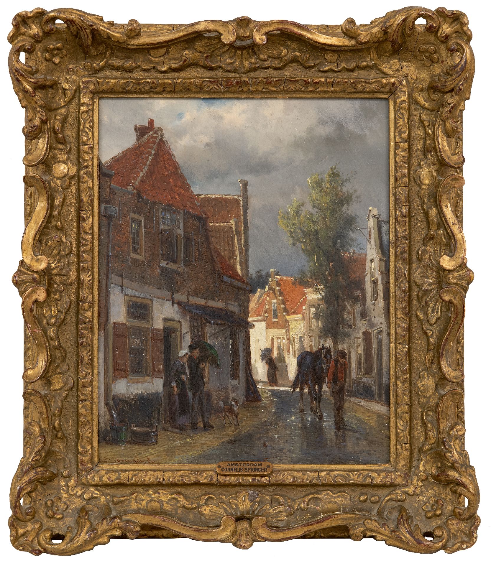 met verso authenticiteitsverklaring van de schilder op verzegeld etiket: 'De ondergetekende verklaart dat dit schilderijtje voorstellende Gezicht te Oudewater bij regenachtig weder door hem is vervaardigd, C. Springer, Amsterdam 21 April 80'