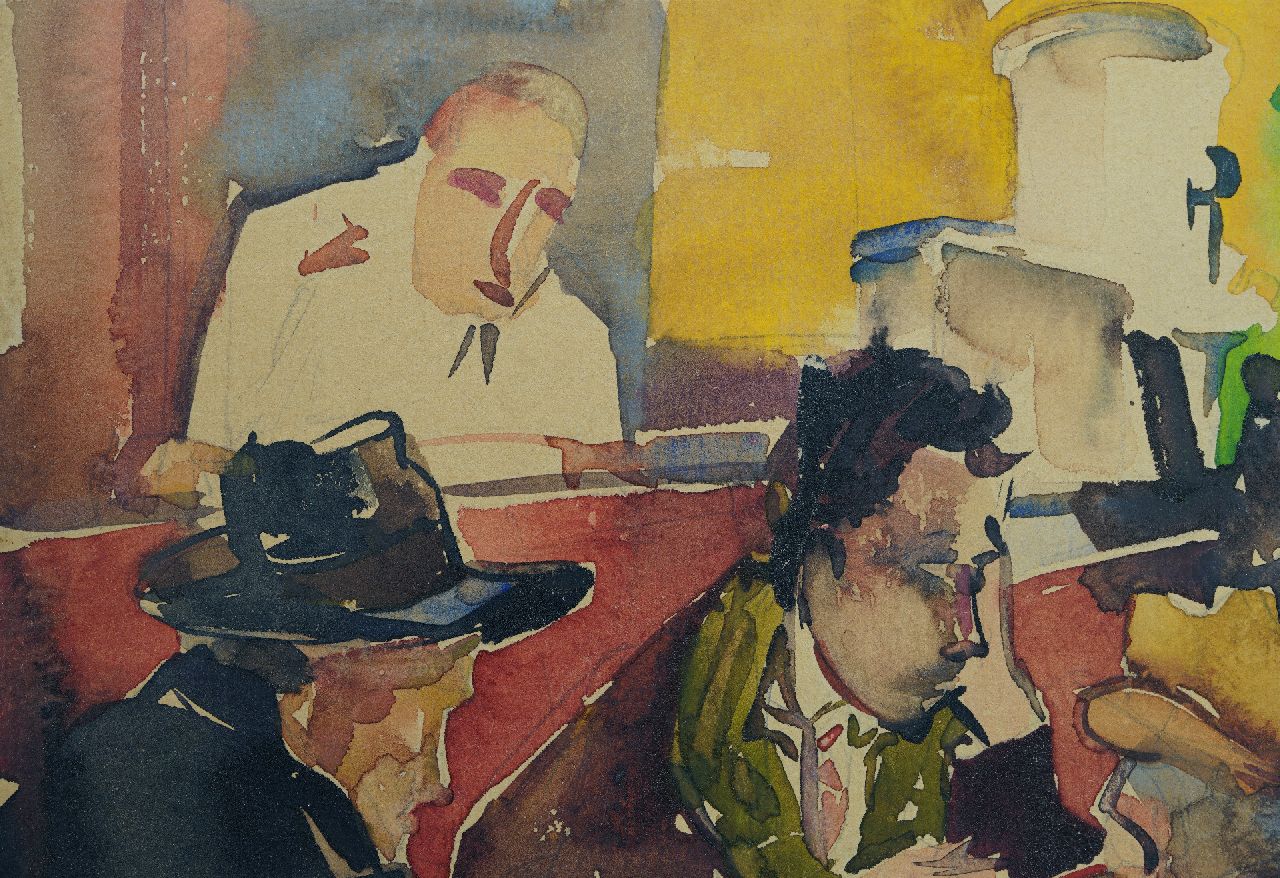 Ernest Albert kunstwerk • aquarel • tekening • te koop Dammen in het café