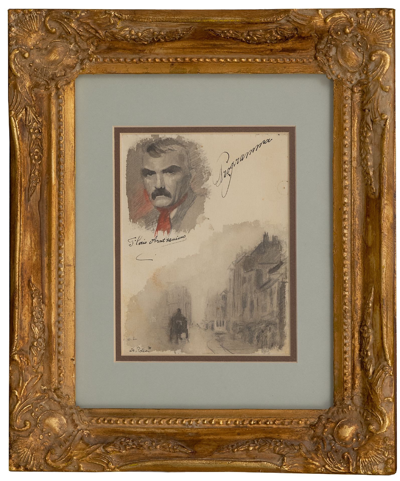 Floris Arntzenius kunstwerk • aquarel • tekening • voorheen te koop Blad met zelfportret en schets van de Lange Poten, Den Haag