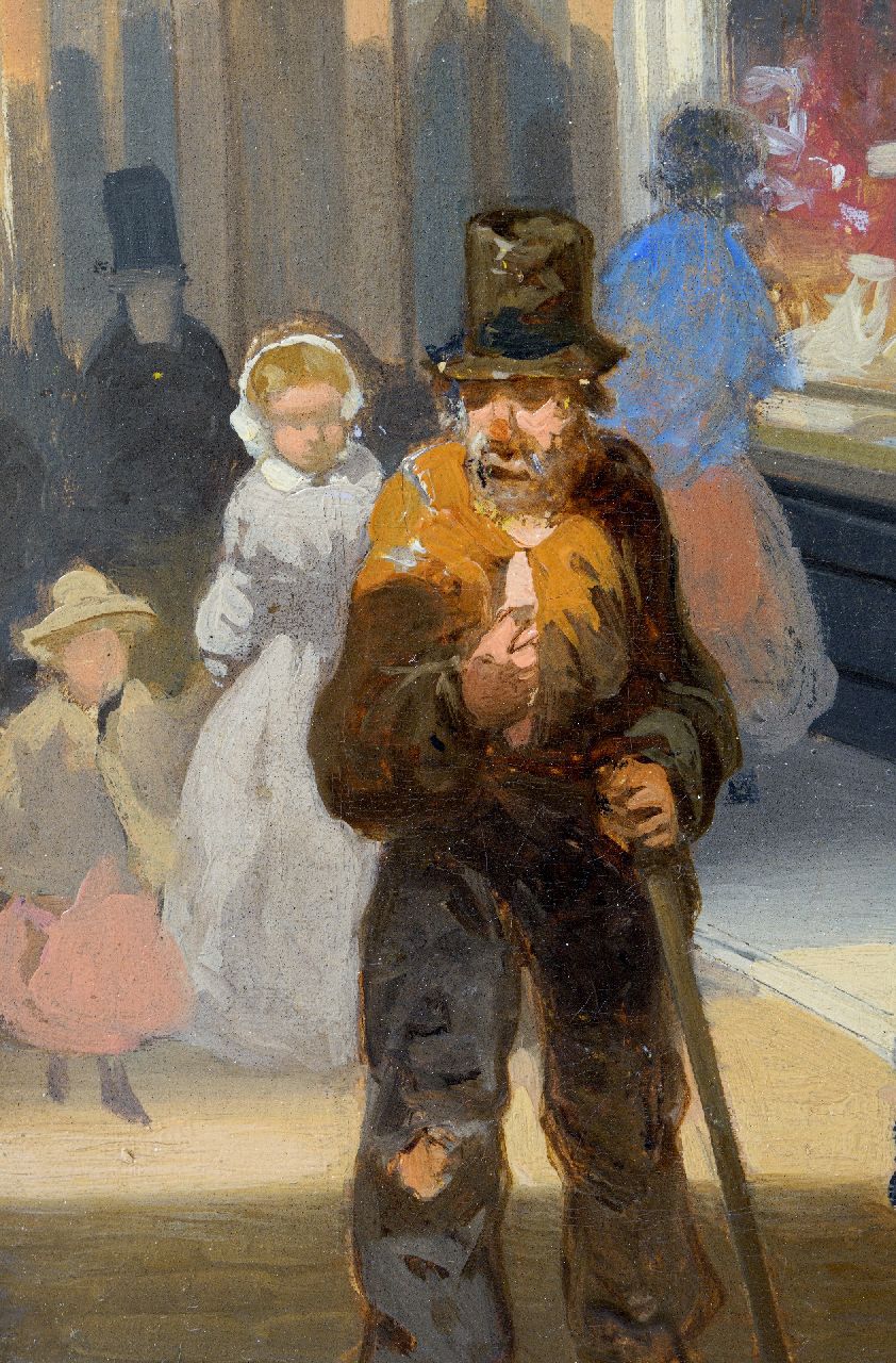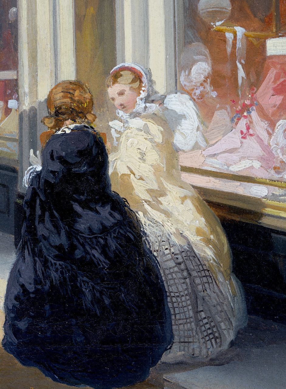 Tegenstellingen in de romantiek: links een zwerver, daarnaast de winkelende rijke dames voor een corsetteriewinkel.