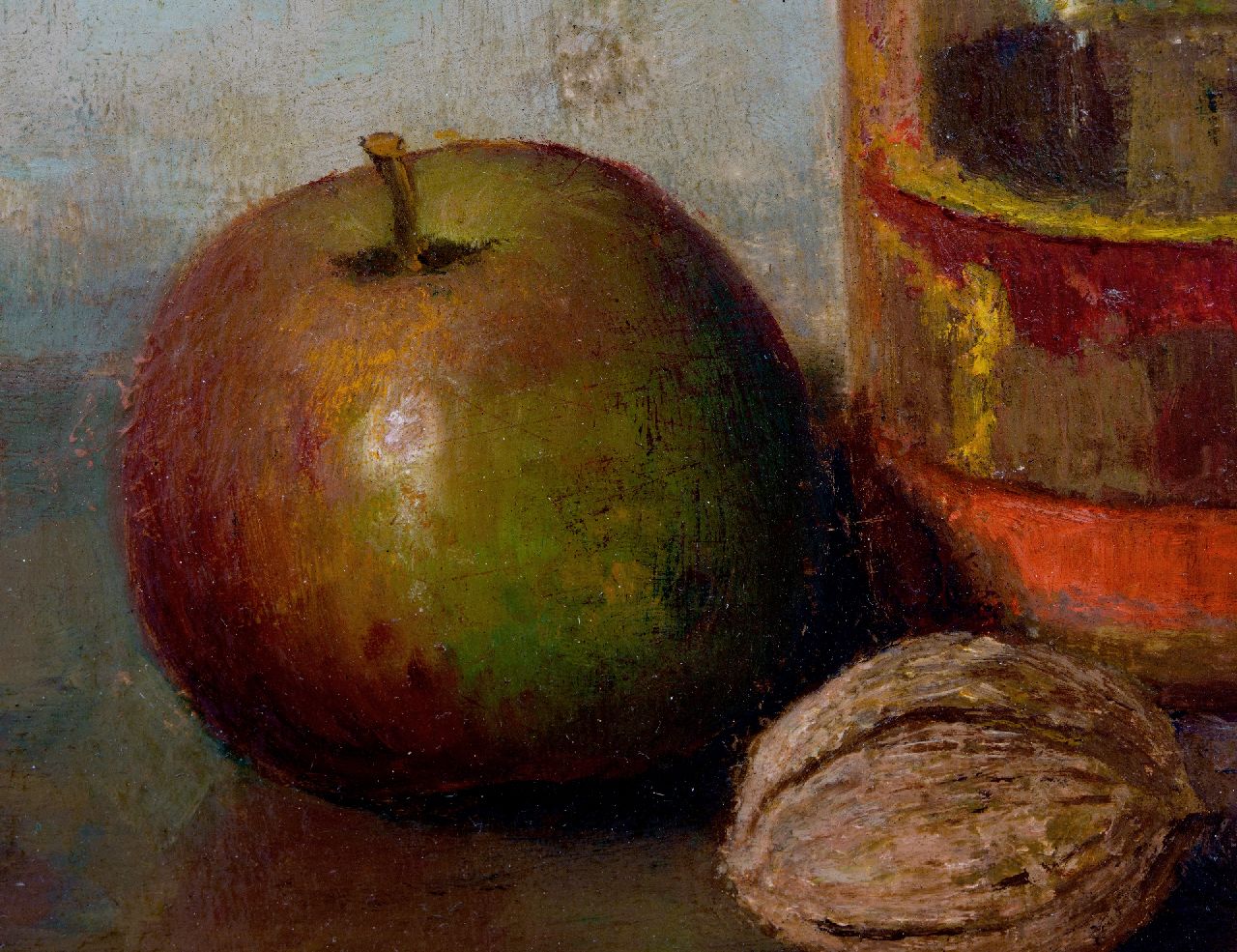 Henk Bos kunstwerk • schilderij • voorheen te koop Stilleven met appel en walnoot