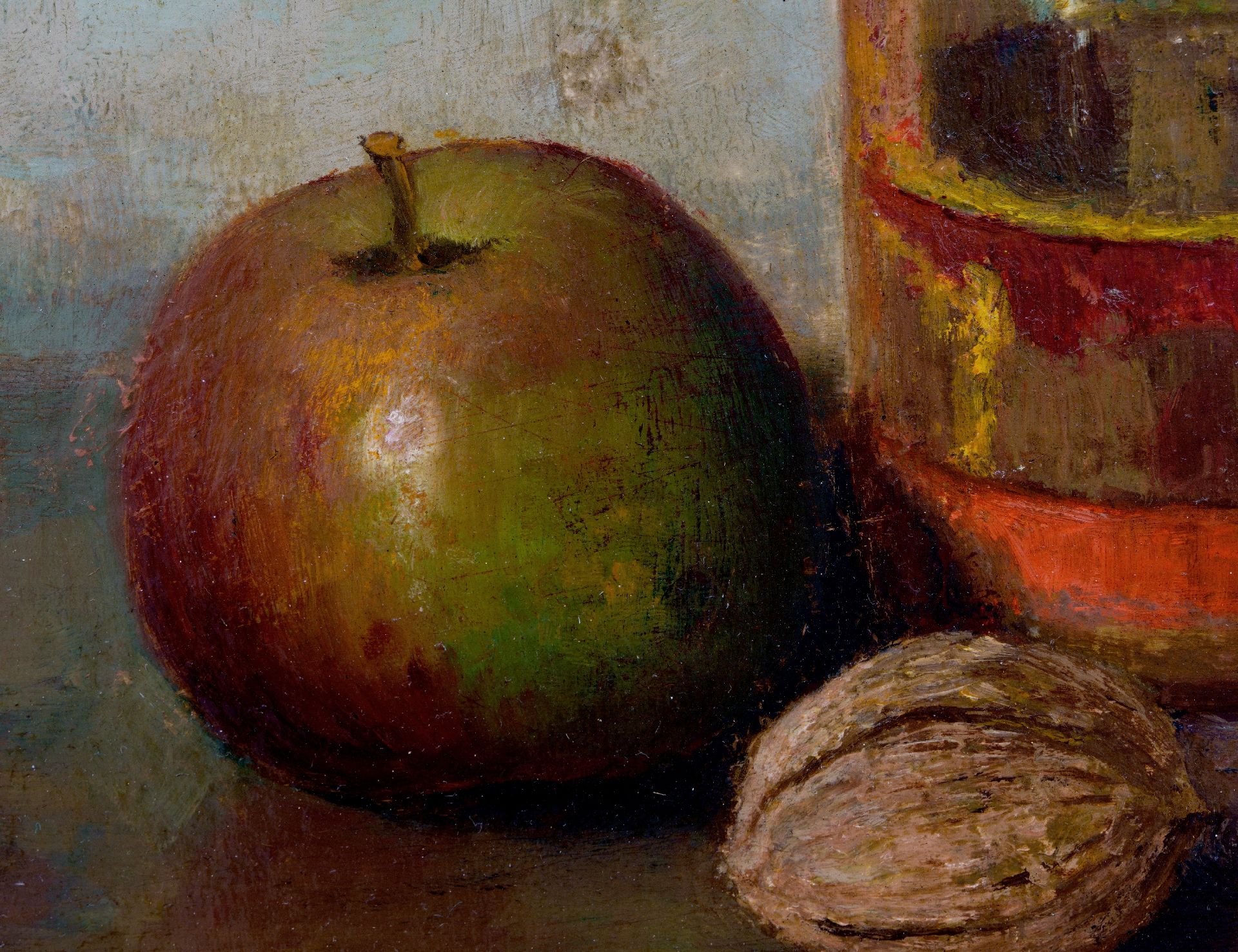 Henk Bos kunstwerk • schilderij • voorheen te koop Stilleven met appel en walnoot