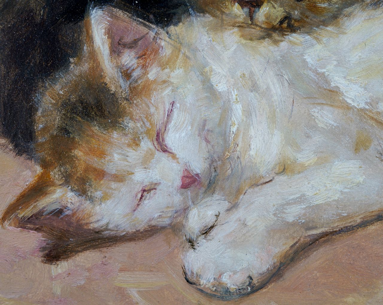 Henriette Ronner-Knip schilderde aanvankelijk dierstukken en honden, maar na 1870 specialiseerde ze zich in het schilderen van poezen. Feilloos wist ze de textuur van vachten, ogen en kleuren weer te geven en trof ze de soms rustige, soms speelse en onderzoekende aard van poezen. Haar werk was vooral geliefd bij de opkomende bourgeoisie in de 19e eeuw. Zij verbeeldt haar dieren dan ook al spelend, slapend en kruipend op en over de kostbare meubels en luxueuze stoffen die bij deze rijk geworden burgers zo in trek waren. Zowel in Nederland als in België werd zij vanwege haar werk geridderd.