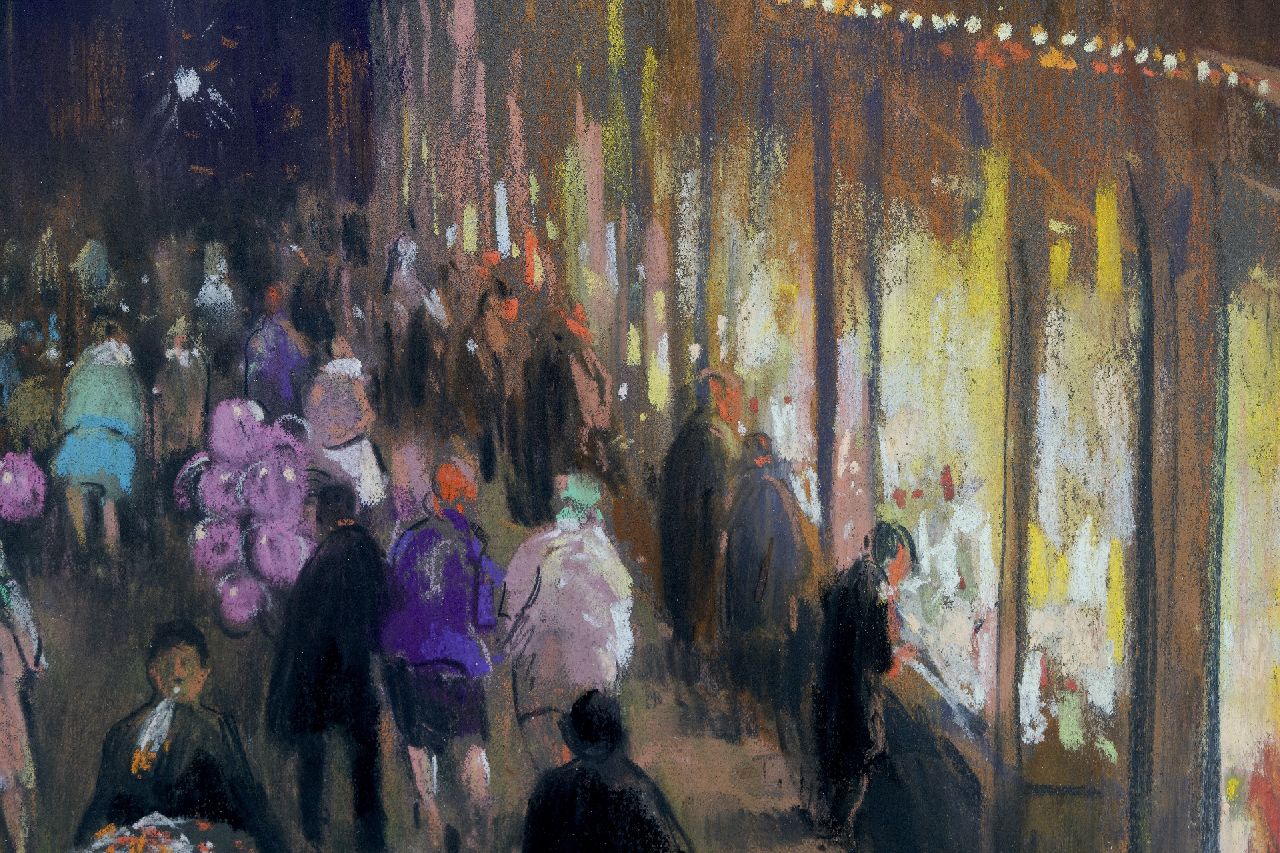 De magie van met lamplicht verlichte etalages begin 20e eeuw, toen winkelen nog een feest was. Gemaakt als illustratie voor een kalender, in 1932 uitgegeven door de Vereniging van Directeuren van Elektriciteitsbedrijven in Nederland. Siert het omslag van het boek ‘Het winkellandschap van Amsterdam’ van Clé Lesger uit 2013.