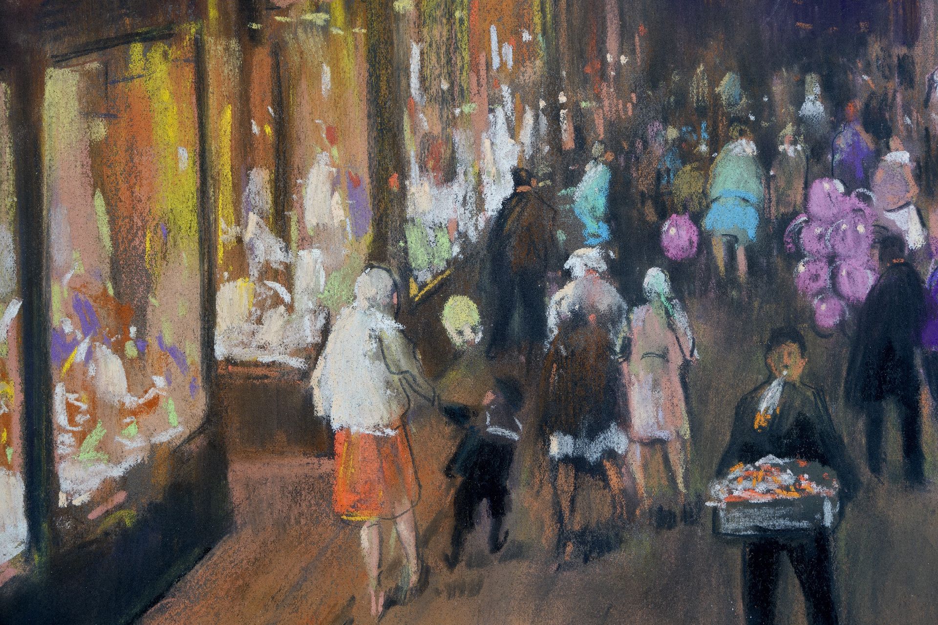 De magie van met lamplicht verlichte etalages begin 20e eeuw, toen winkelen nog een feest was. Gemaakt als illustratie voor een kalender, in 1932 uitgegeven door de Vereniging van Directeuren van Elektriciteitsbedrijven in Nederland. Siert het omslag van het boek ‘Het winkellandschap van Amsterdam’ van Clé Lesger uit 2013.