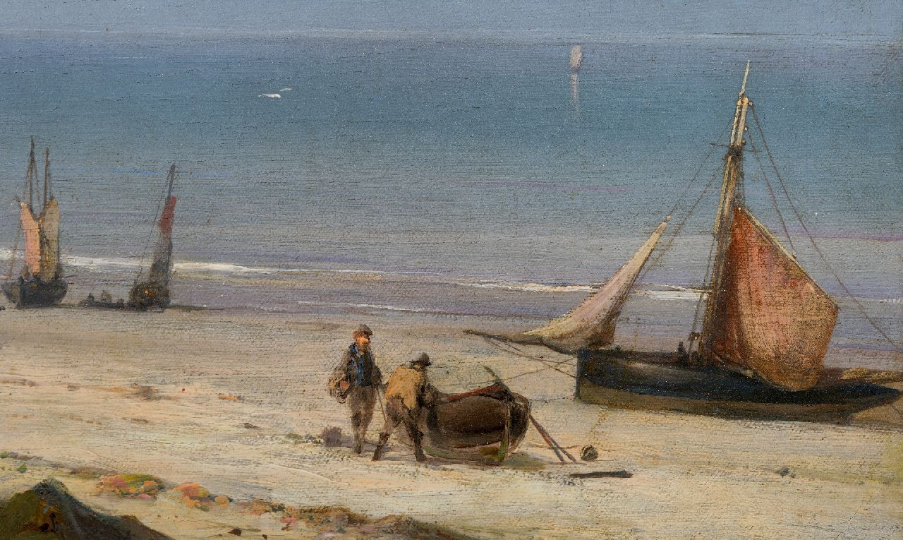 Hermanus Koekkoek kunstwerk • schilderij • te koop Strandgezicht met vissers en schepen langs een rotskust