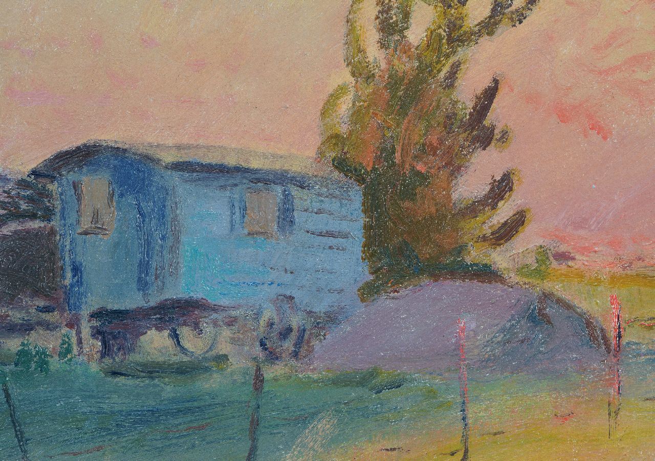 Jan Altink kunstwerk • schilderij • te koop Boerderij Blauwborgje aan het Reitdiep; verso: landschap met loods en schaftkeet