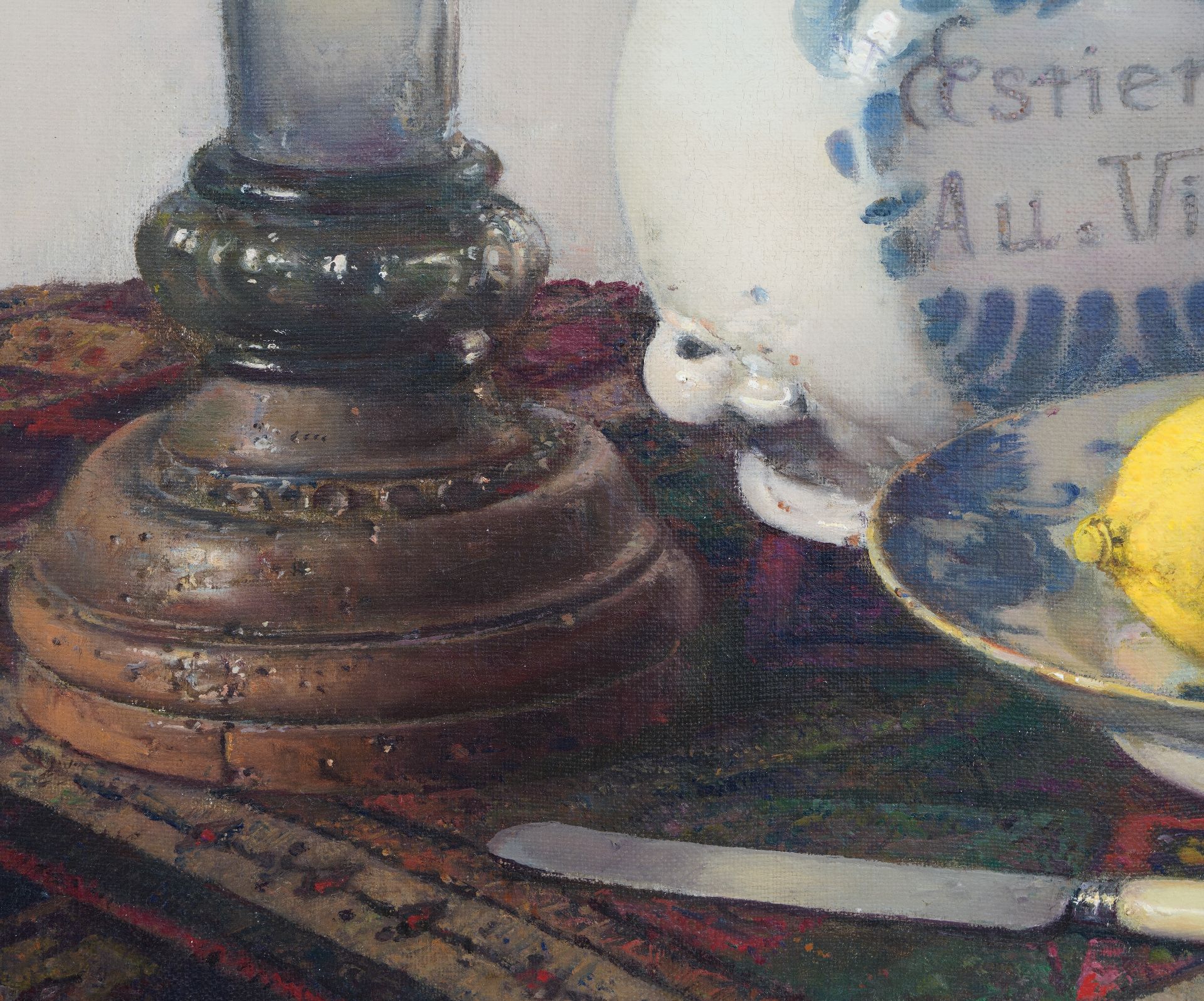 Jan Bogaerts kunstwerk • schilderij • te koop Stilleven met roemer, stenen kruik en bord met citroenen