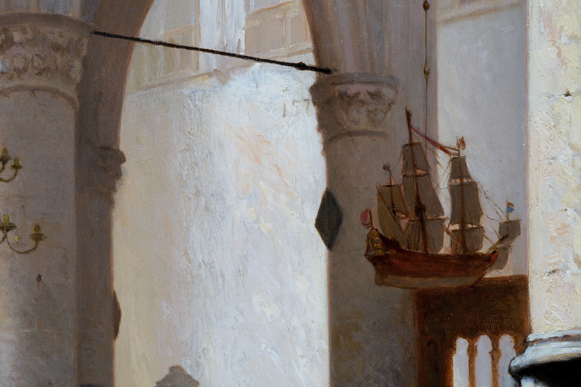 Votiefscheepjes komen vaker voor in een kerk, meestal geschonken door schippers als dank aan hun eschermheilige. Dit scheepje is een model van Michiel de Ruyters oorlogsschip De Zeven Provinciën en herinnert aan zijn zeeslagen waaronder de Tocht naar Chatham.