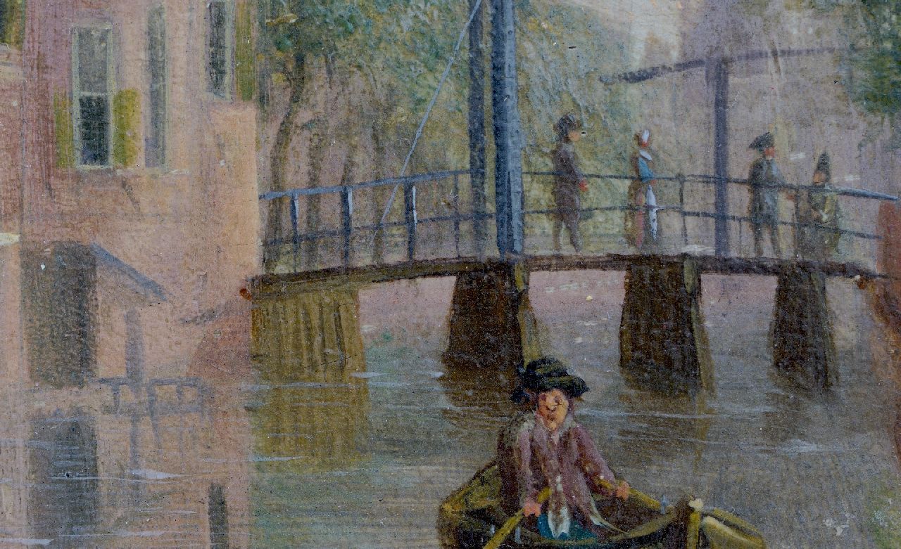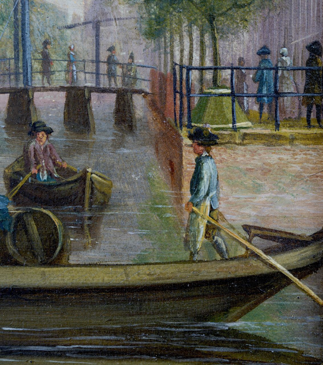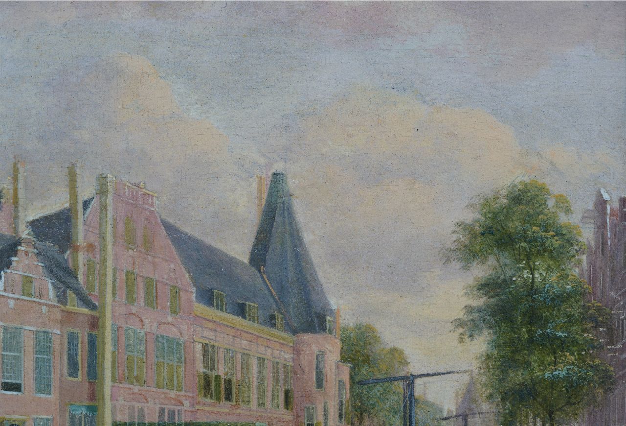 De Amsterdammer Jan ten Compe maakte veel topografische tekeningen, maar met zijn geschilderde stadsgezichten kreeg hij veruit de grootste bekendheid. In zijn schilderijen combineert hij de fijne detaillering van de gebouwen met prachtig uitgewerkte luchtpartijen daarboven. De Kloveniersdoelen, op dit schilderij te zien links, vóór de toren 'Swych Utrecht', diende als verzamelplaats en oefenruimte voor een aantal compagnieën van de plaatselijke schutterij. De Nachtwacht, het door Rembrandt in 1642 afgeleverde groepsportret van een van de klovenierscompagnieën, hing tot rond 1715 in de grote feestzaal van de Kloveniersdoelen. Rembrandt was in 1635 verhuisd met zijn vrouw Saskia van Uylenburgh naar een huurhuis aan de Nieuwe Doelenstraat, waar ze tot 1637 bleven wonen. De straat was toen een deftige plek om te wonen, met mooie, nieuwe huizen.
