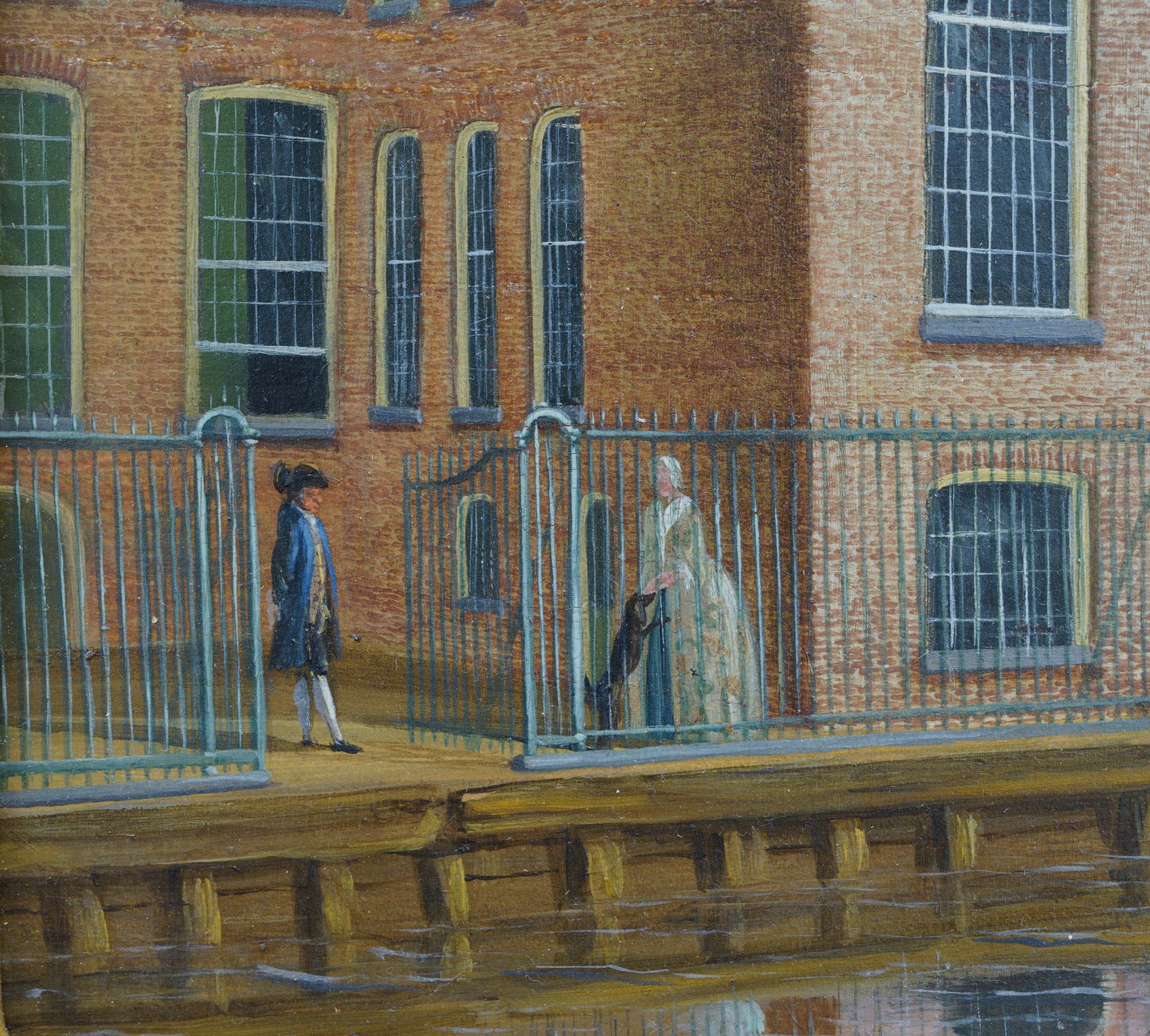 De Amsterdammer Jan ten Compe maakte veel topografische tekeningen, maar met zijn geschilderde stadsgezichten kreeg hij veruit de grootste bekendheid. In zijn schilderijen combineert hij de fijne detaillering van de gebouwen met prachtig uitgewerkte luchtpartijen daarboven. De Kloveniersdoelen, op dit schilderij te zien links, vóór de toren 'Swych Utrecht', diende als verzamelplaats en oefenruimte voor een aantal compagnieën van de plaatselijke schutterij. De Nachtwacht, het door Rembrandt in 1642 afgeleverde groepsportret van een van de klovenierscompagnieën, hing tot rond 1715 in de grote feestzaal van de Kloveniersdoelen. Rembrandt was in 1635 verhuisd met zijn vrouw Saskia van Uylenburgh naar een huurhuis aan de Nieuwe Doelenstraat, waar ze tot 1637 bleven wonen. De straat was toen een deftige plek om te wonen, met mooie, nieuwe huizen.