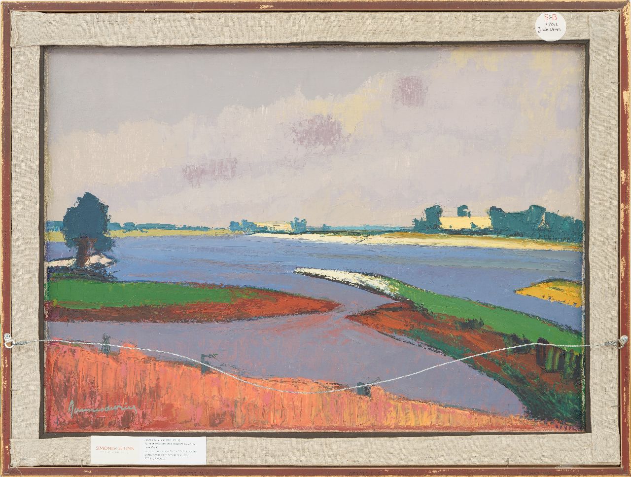 Jannes de Vries kunstwerk • schilderij • te koop Boerderij, Westerwolde; VERSO: zicht op de Waal