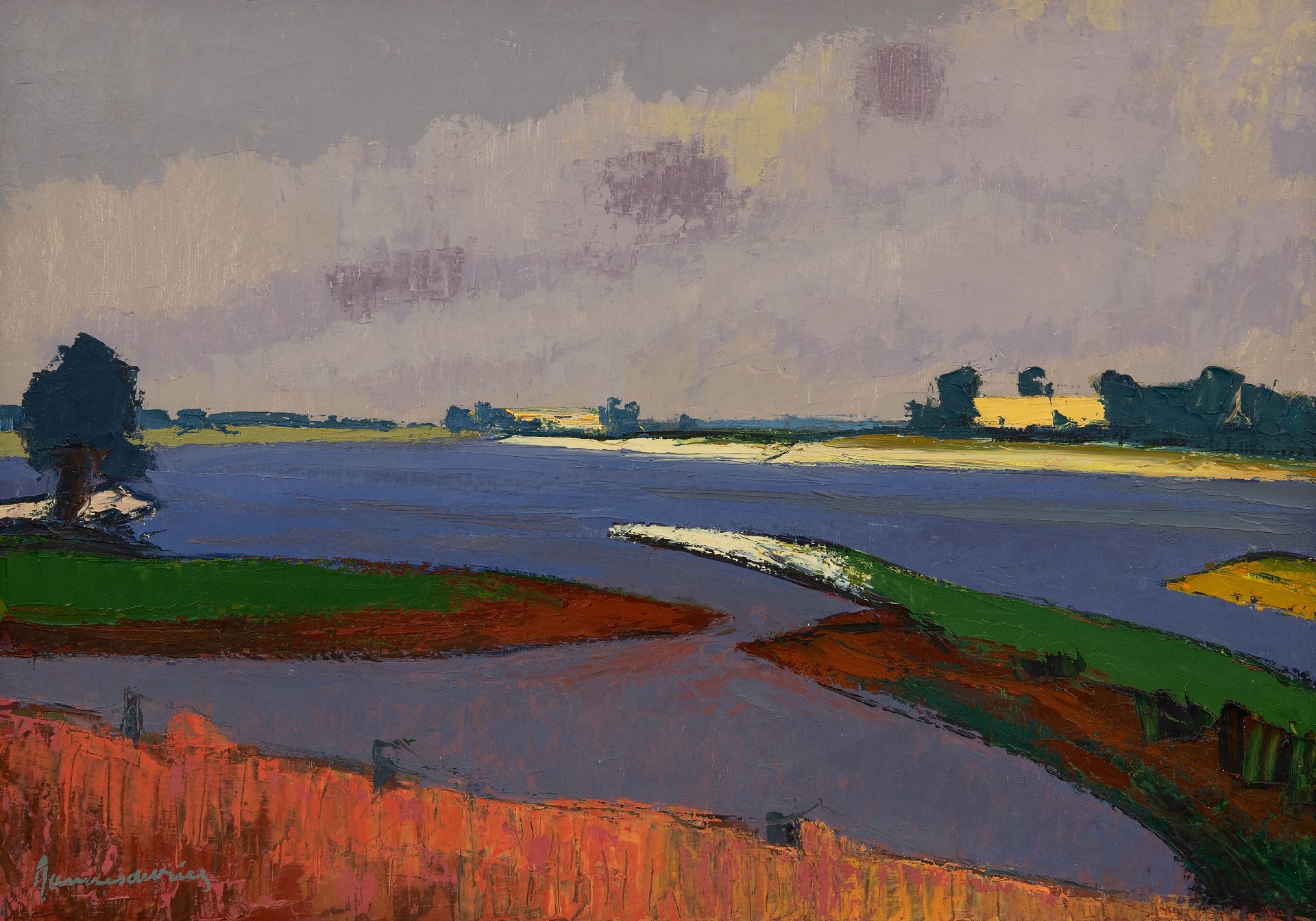 Jannes de Vries kunstwerk • schilderij • te koop Boerderij, Westerwolde; VERSO: zicht op de Waal