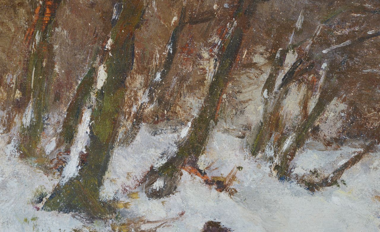 De Haagse schilder Johannes Evert Akkeringa werd vooral bekend om zonnige duin- en strandgezichten, bevolkt door vrouwen en kinderen. Het zijn vrijwel altijd zomerse, blijmoedige voorstellingen, de vrouwen vredig werkend, de kinderen spelend onder een blauwe lucht. Met de Hollandse winters had de in het tropische Indonesië geboren Akkeringa vermoedelijk niet zoveel op. Het was dan koud, en als de natuur bedekt was met een laag sneeuw werden de wegen en paden onbegaanbaar en was alles op wielen onbruikbaar. Dan kwamen de sledes tevoorschijn. Een schilder met een goed oog, zoals hij, zag daarin toch wel iets moois. In dit winterse tafereeltje schildert hij een groepje spelende kinderen bij een vrouw met een duwslee. Daarin ligt vermoedelijk een warm ingepakt kindje, waar ze nieuwsgierig en verwonderd naar kijken.