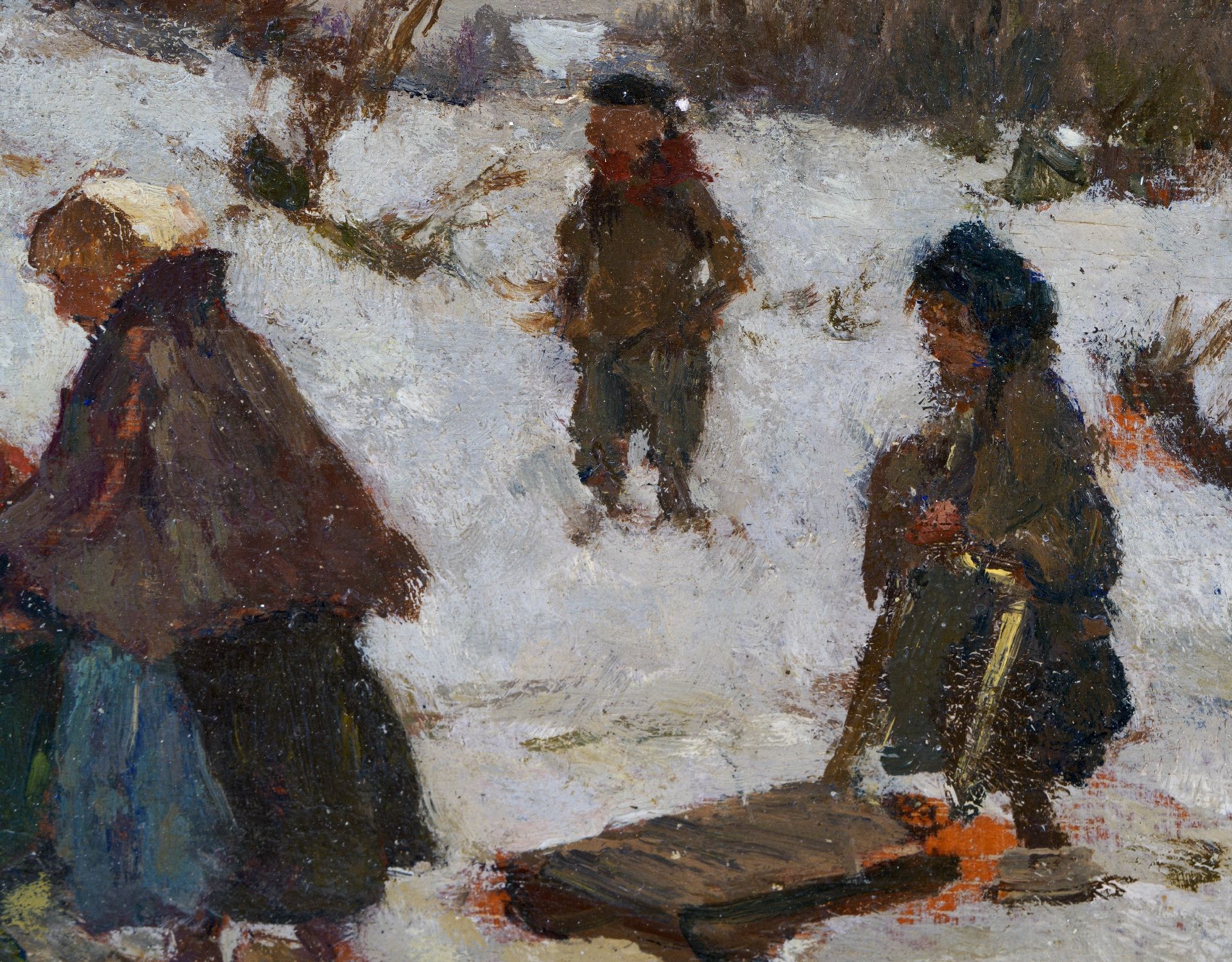 De Haagse schilder Johannes Evert Akkeringa werd vooral bekend om zonnige duin- en strandgezichten, bevolkt door vrouwen en kinderen. Het zijn vrijwel altijd zomerse, blijmoedige voorstellingen, de vrouwen vredig werkend, de kinderen spelend onder een blauwe lucht. Met de Hollandse winters had de in het tropische Indonesië geboren Akkeringa vermoedelijk niet zoveel op. Het was dan koud, en als de natuur bedekt was met een laag sneeuw werden de wegen en paden onbegaanbaar en was alles op wielen onbruikbaar. Dan kwamen de sledes tevoorschijn. Een schilder met een goed oog, zoals hij, zag daarin toch wel iets moois. In dit winterse tafereeltje schildert hij een groepje spelende kinderen bij een vrouw met een duwslee. Daarin ligt vermoedelijk een warm ingepakt kindje, waar ze nieuwsgierig en verwonderd naar kijken.