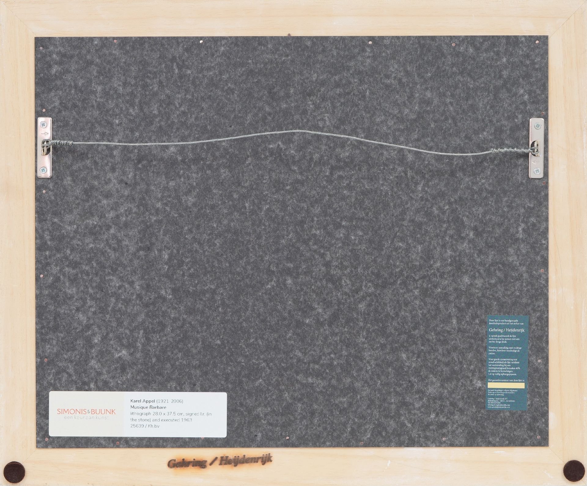 Karel Appel was één van de hoofdfiguren van de CoBrA-beweging (1948-1951). Zijn werk wordt gezien als representatief voor de idealen van deze groep naoorlogse schilders, die in hun werk uitdrukking gaven aan hun verzet tegen de traditionele schilderkunst met haar regels en taboes. In zijn CoBrA-tijd schilderde Appel fabeldieren en fantasiewezens. Na 1951 werd zijn schildertrant steeds heftiger, totdat lijn en kleurvlak samensmolten tot één turbulente, expressieve verfmassa. Deze litho van Appel maakte oorspronkelijk deel uit van een set, uitgegeven in 1963. Deze set bestond uit het boek Musique Barbare, met 25 foto’s van Karel Appel aan het werk in zijn atelier gemaakt door Ed van der Elsken en tekst van Jan Vrijman. Bij deze uitgave verscheen de speciaal door Karel Appel gemaakte kleurenlitho 'Musique Barbare' en een LP in een hoes van 4 pagina’s. De tekst hierop was ook van Jan Vrijman en de fotografie van Ed van der Elsken.