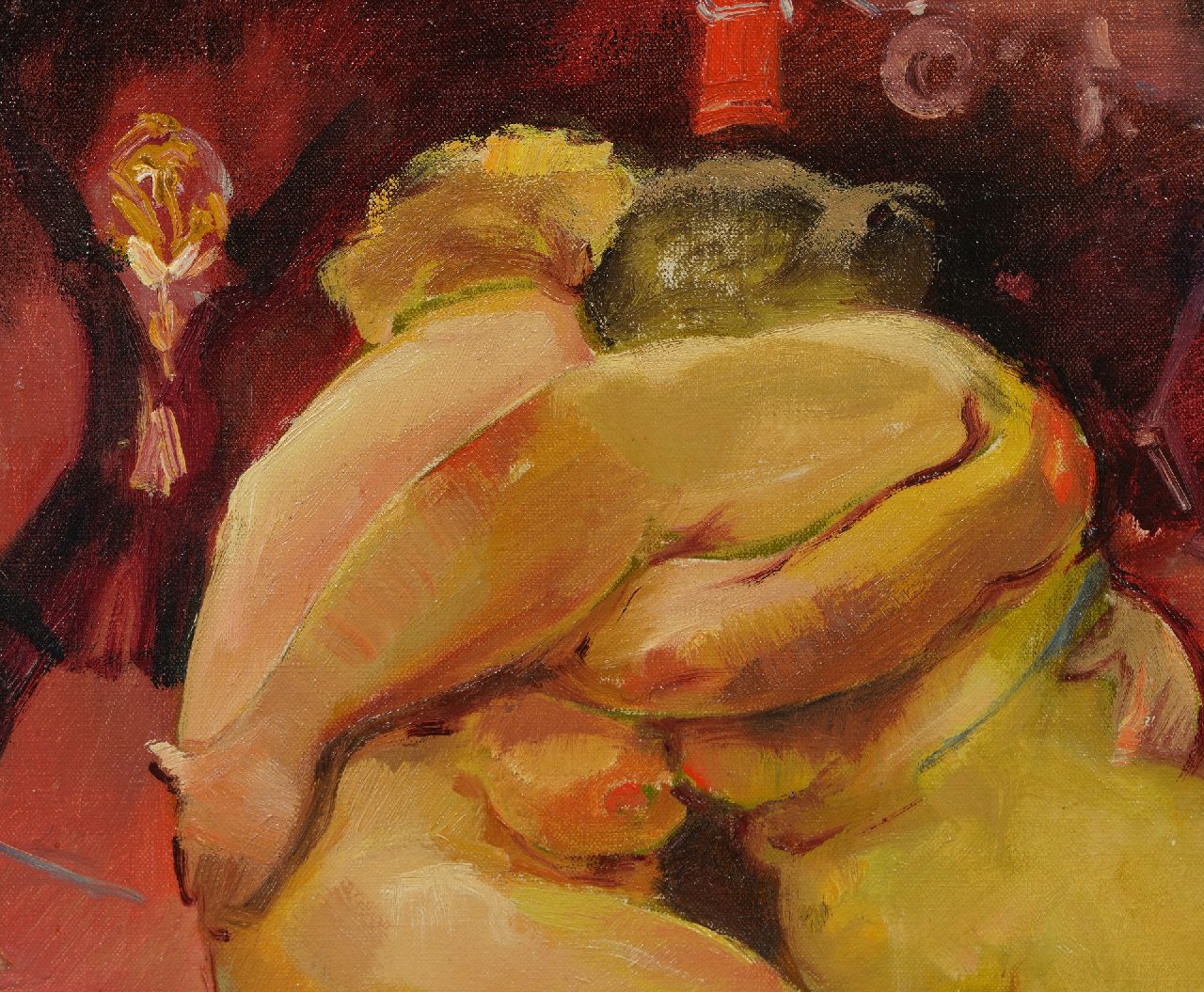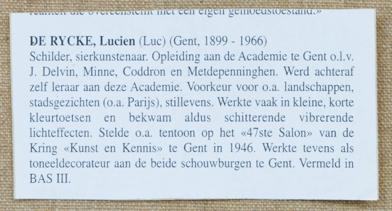 De Belgische Luc de Rycke was vrij kunstschilder en werkte tevens als toneeldecorateur aan de beide schouwburgen in zijn geboorteplaats Gent. In zijn vrije werk had De Rycke een voorkeur voor landschappen, stadgezichten en stillevens, die hij schilderde in een naar pointillisme neigend impressionisme. Dit figuurstuk is letterlijk en figuurlijk steviger van aard: worstelende vrouwen die met een breed penseel als massieve vormen op het doek gezet zijn. Rondom zijn verschillende motieven te zien, die gezamenlijk een ietwat vervreemdend effect geven. De Ryckes ervaring als toneeldecorateur speelt hier wellicht mee: het op de achtergrond toevoegen van attributen voor een extra verhalend element.
