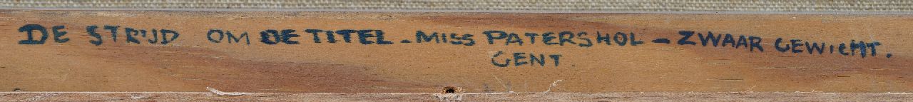 annotatie op spieraam: 'De strijd om de titel - miss Patershol - zwaar gewicht. Gent'