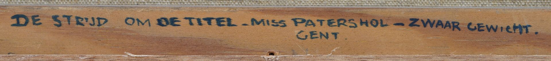 annotatie op spieraam: 'De strijd om de titel - miss Patershol - zwaar gewicht. Gent'