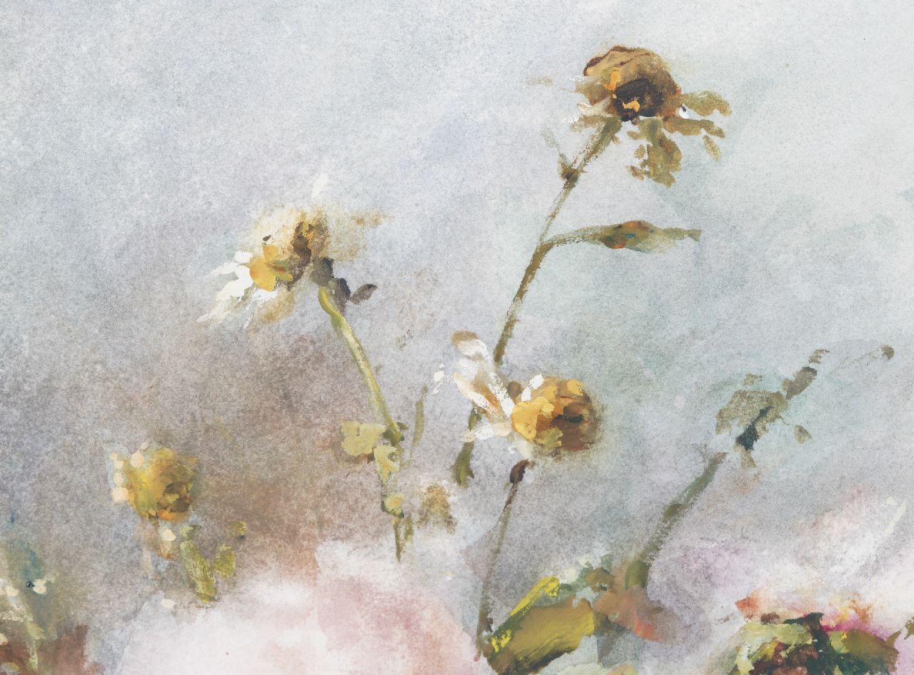 Margaretha Roosenboom | Witte chrysanten op een stenen plint, aquarel op papier, 44,6 x 74,9 cm, gesigneerd r.o.