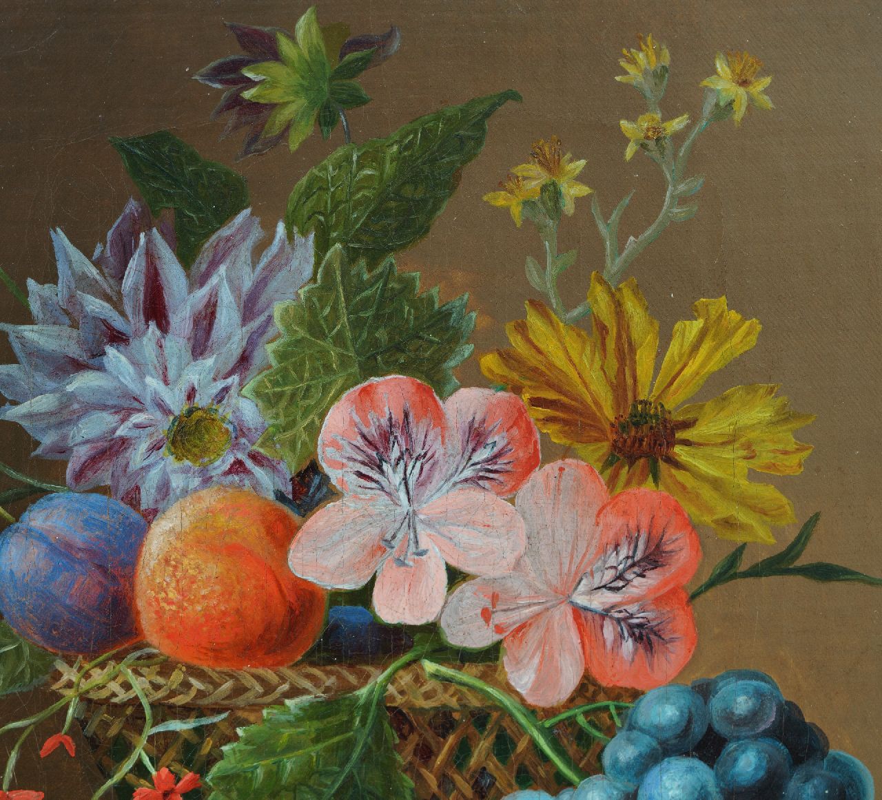 Onbekend kunstwerk • schilderij • te koop Stilleven met bloemen en fruit in een mand