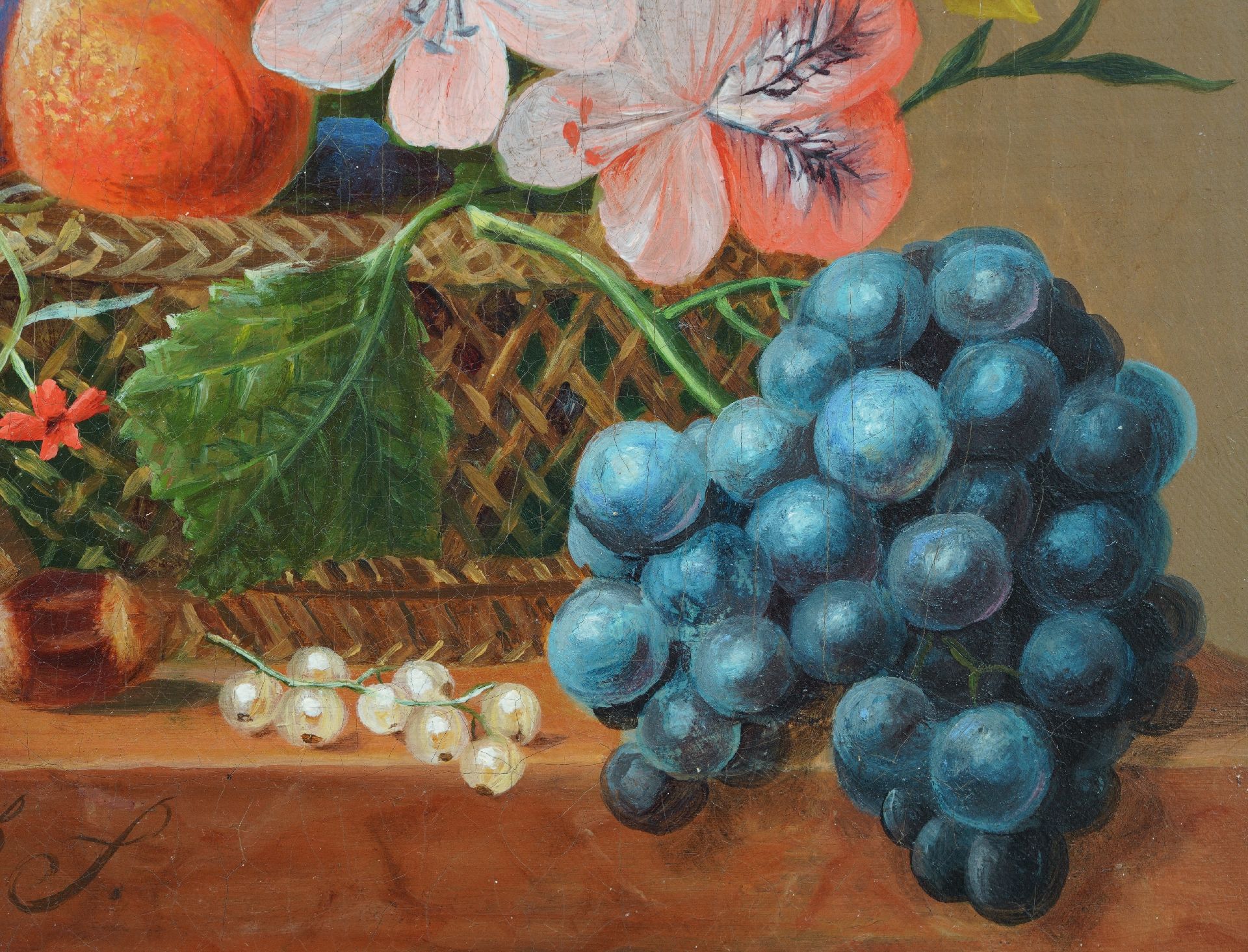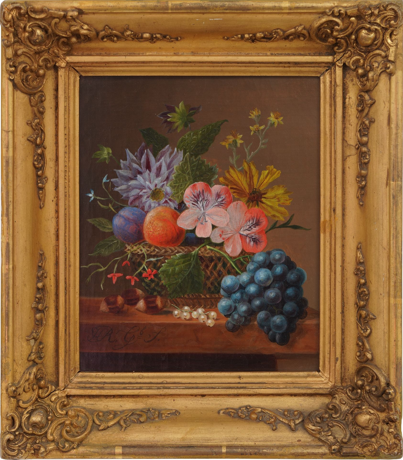 Onbekend kunstwerk • schilderij • te koop Stilleven met bloemen en fruit in een mand