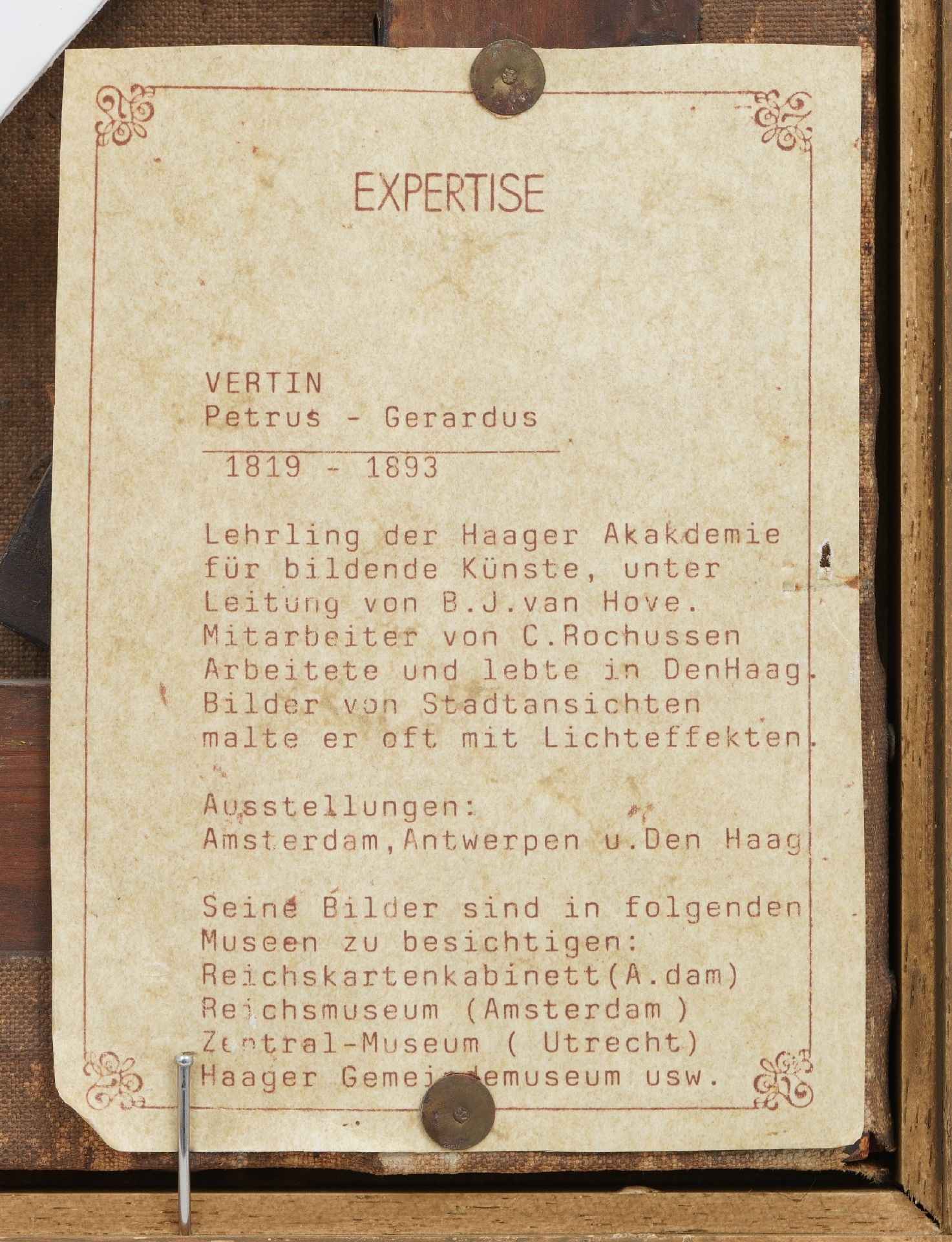 Petrus Gerardus Vertin kreeg zijn opleiding aan de academie van Den Haag waardoor zijn werk gerekend wordt tot de Haagse romantiek. Hij schilderde Hollandse stadsgezichten en straatjes in zomer en winter. Deze liet hij zo nu en dan stofferen door zijn vrienden Charles Rochussen, J.F. Hoppenbrouwers en S.L. Verveer. Soms is zijn werk topografisch, maar meestal koos Vertin voor fantasiebeelden. In zijn wintergezichten besteedde hij veel aandacht aan de weerkaatsing van het licht op besneeuwde daken, kozijnen en stoepen.
