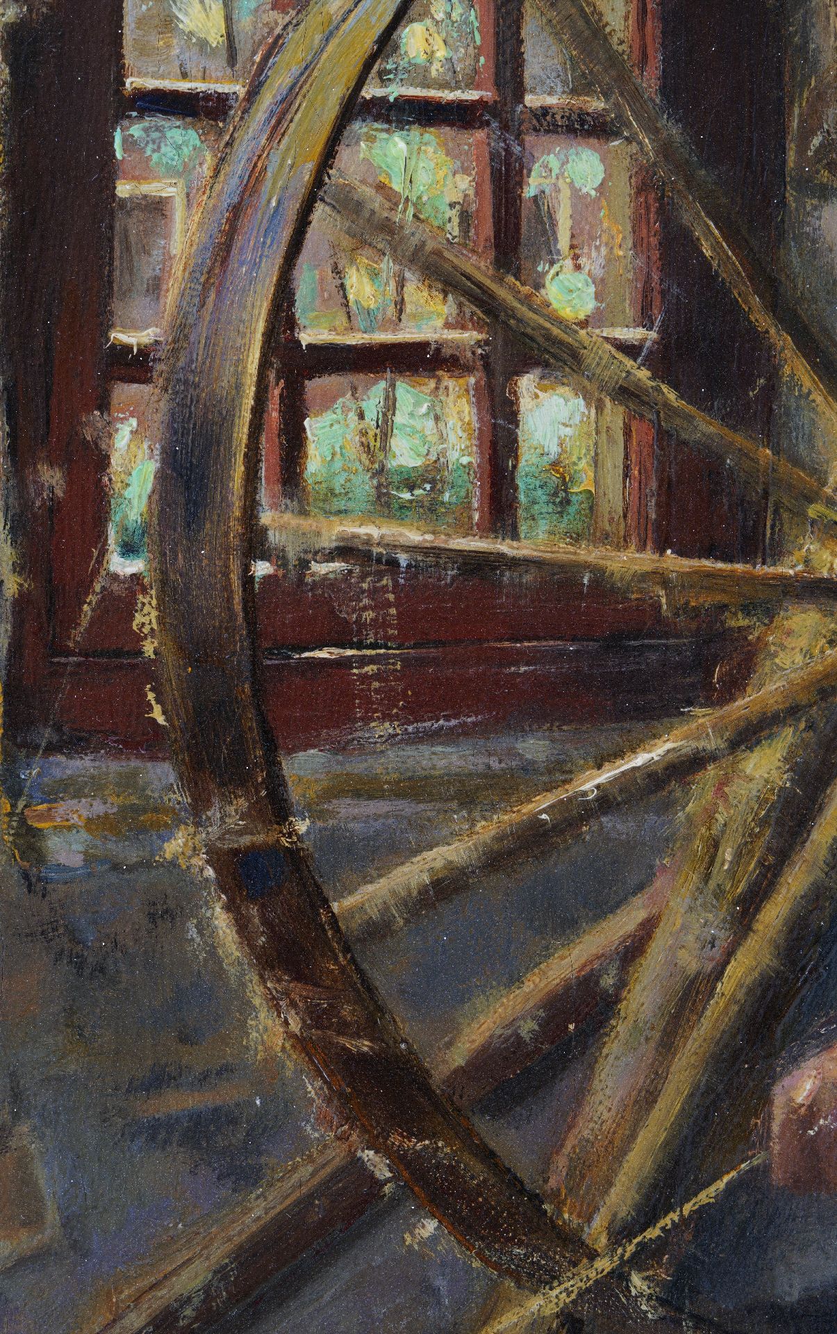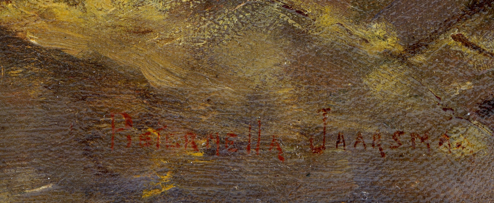 Pieternella Jaarsma kunstwerk • schilderij • te koop Interieur met wol spinnende boer