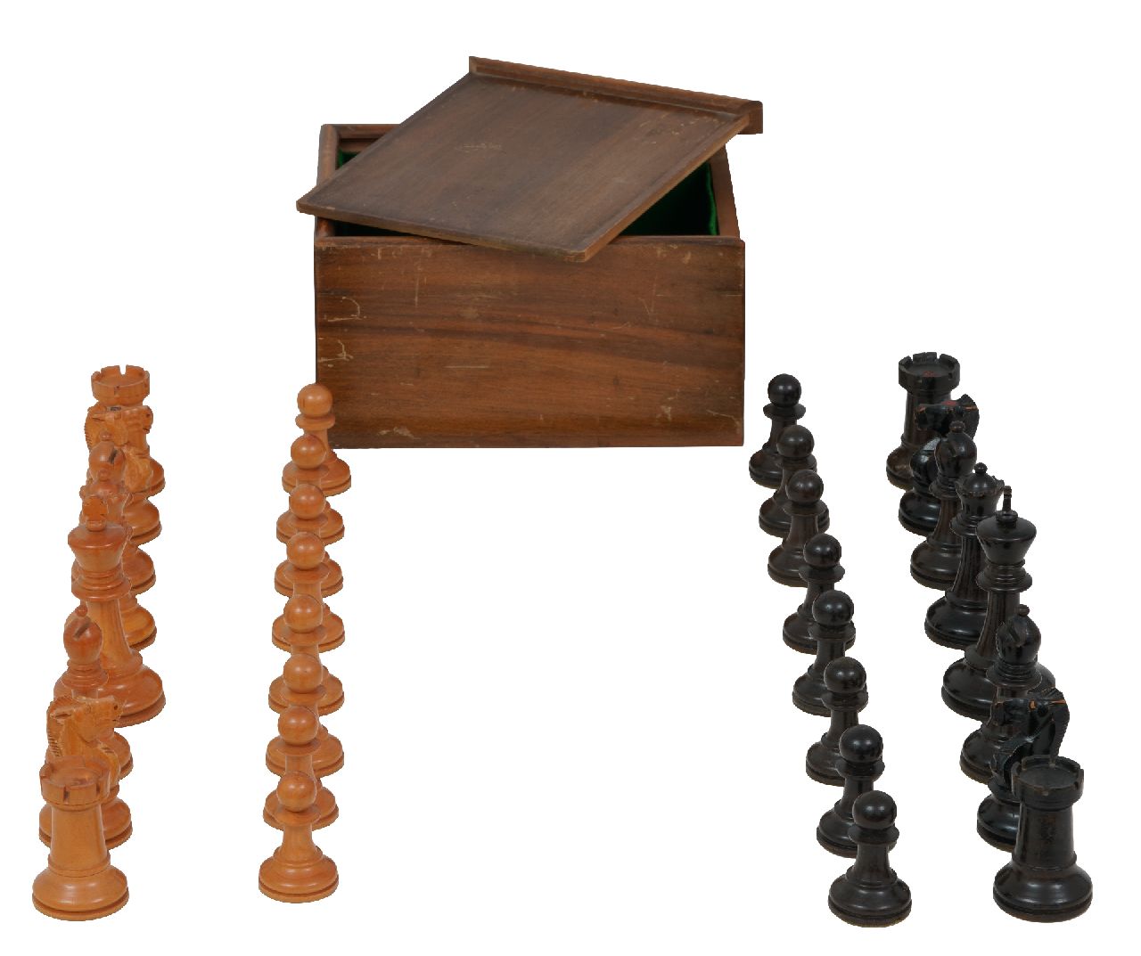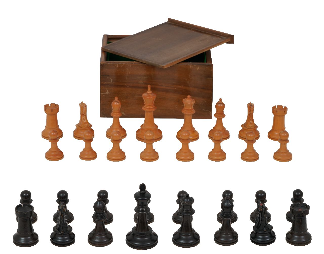 Schaakset, opbergdoos kunstwerk • beeld • sculptuur • te koop Schaakset in 'Staunton' stijl in houten doos