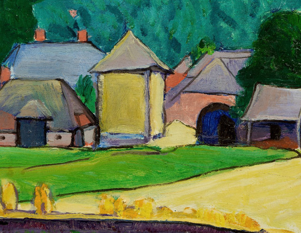 Vilmos Huszár kunstwerk • schilderij • te koop Boerderijen in een glooiend landschap