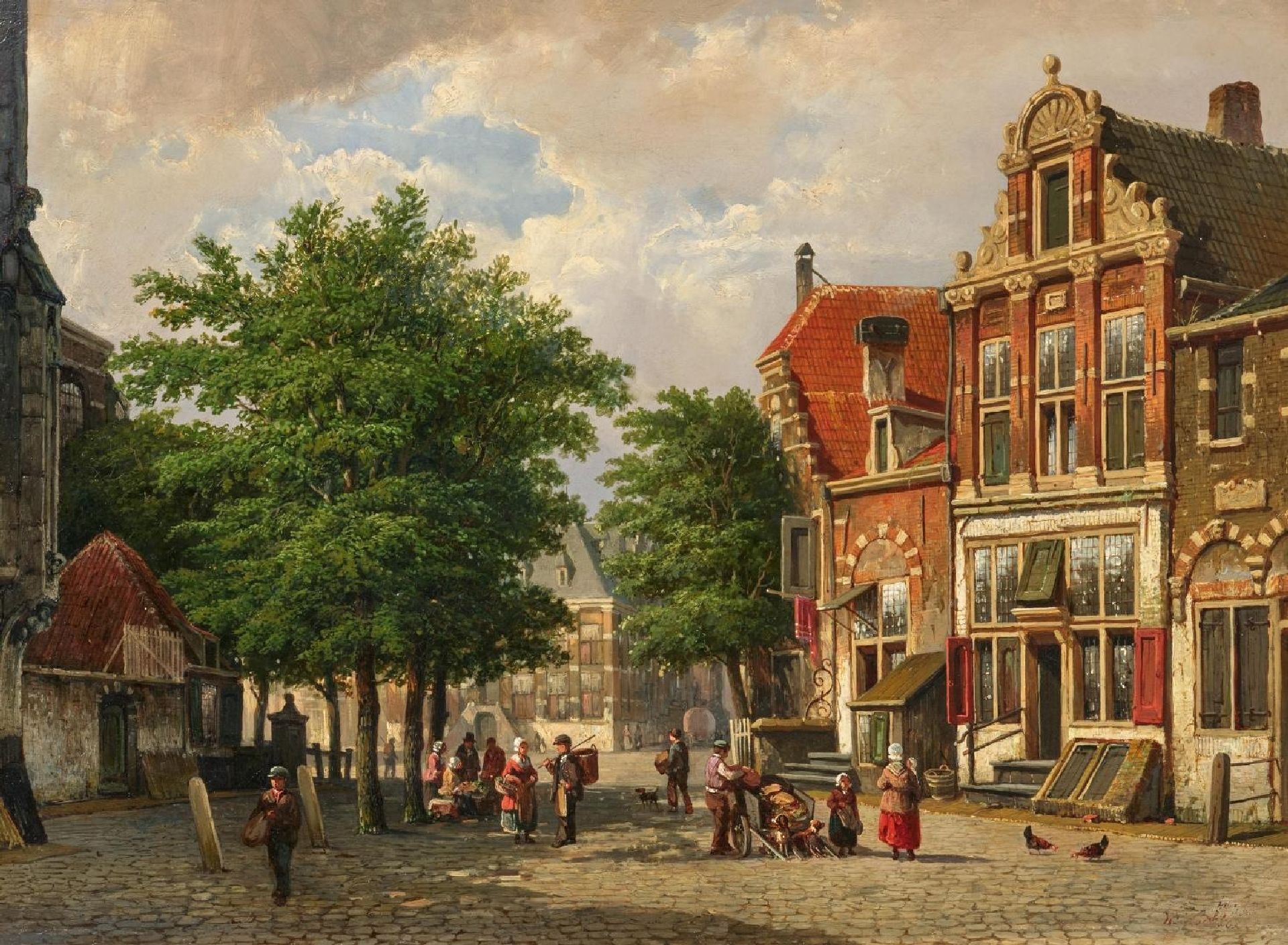 Willem Koekkoek kunstwerk • schilderij • te koop Zomers stadsgezicht met figuren bij een kerk