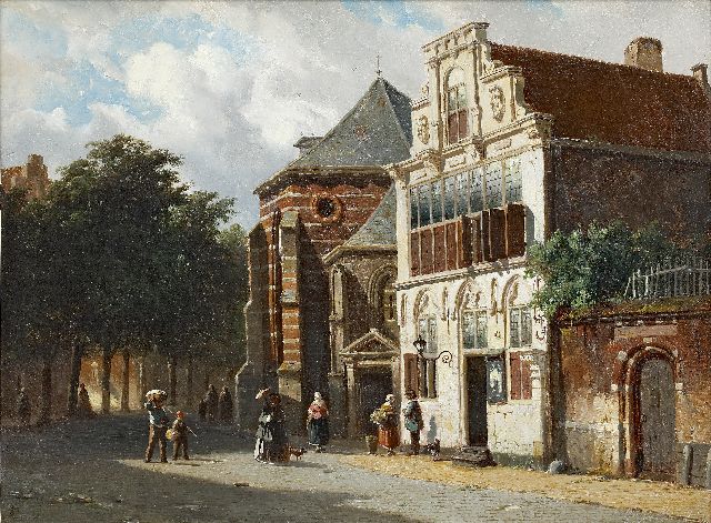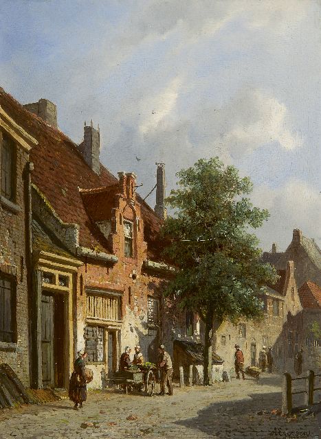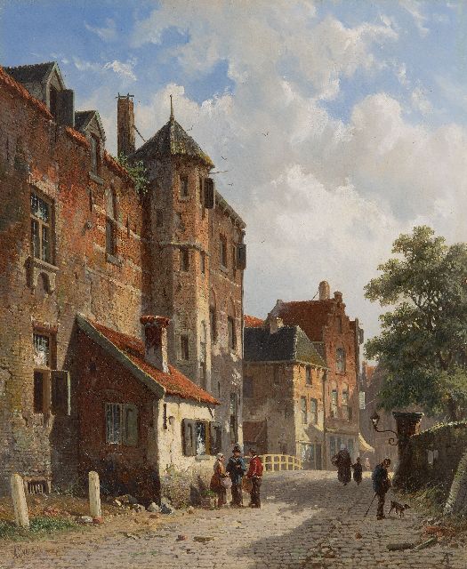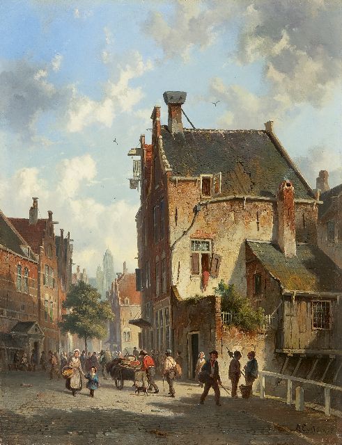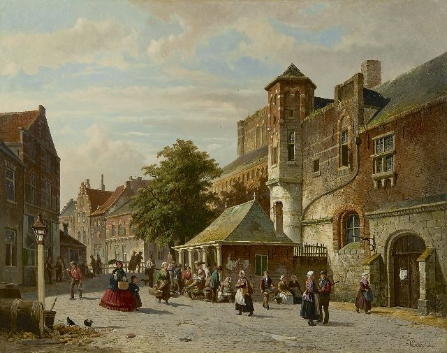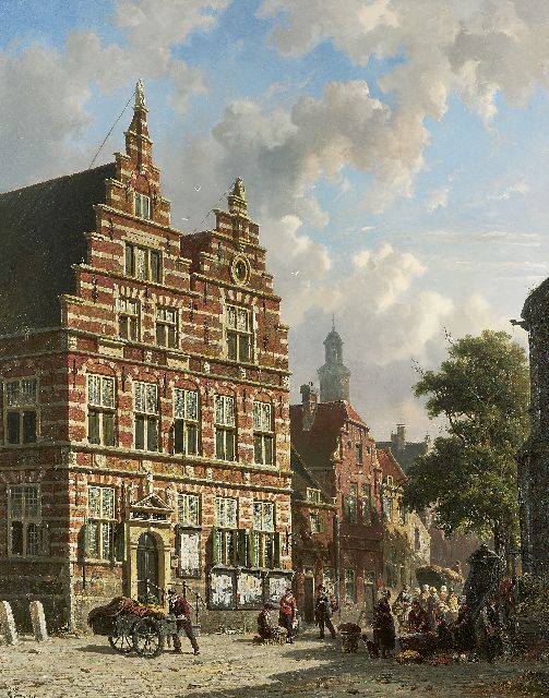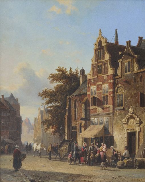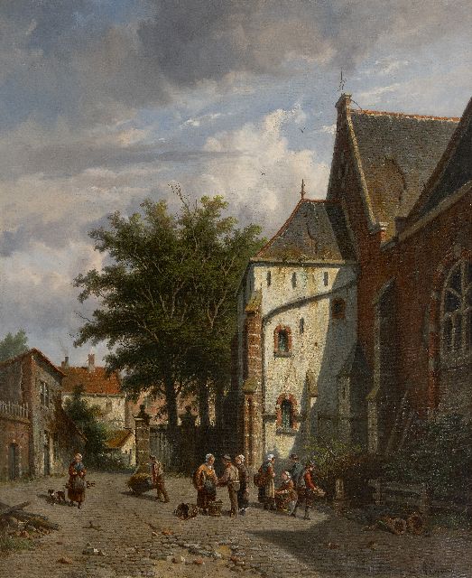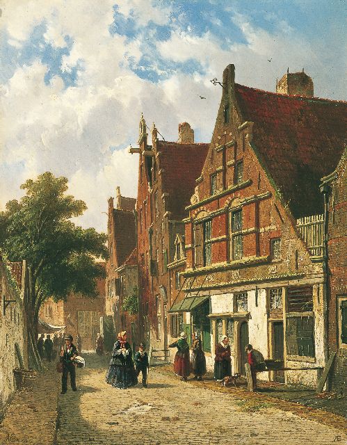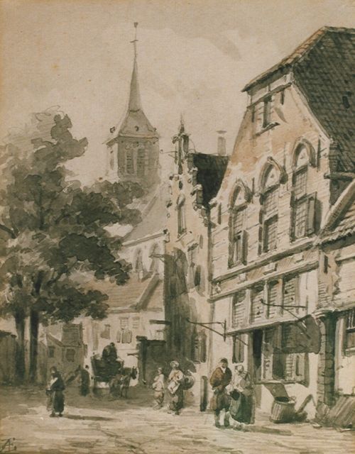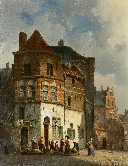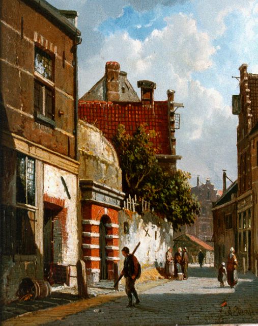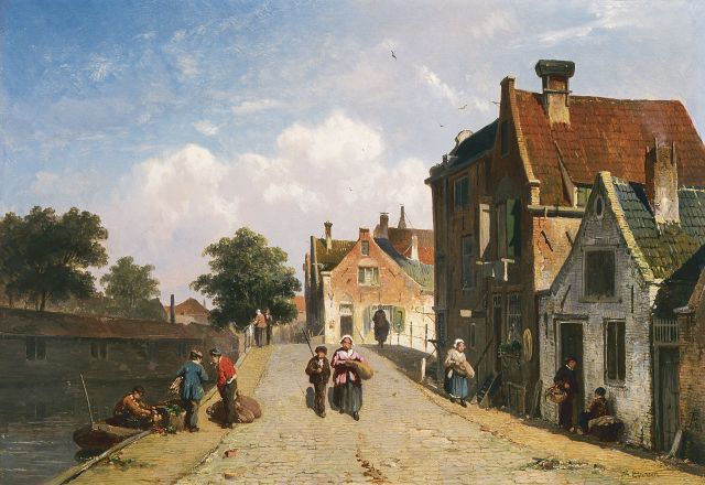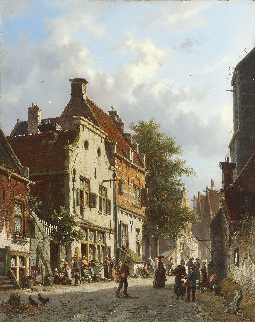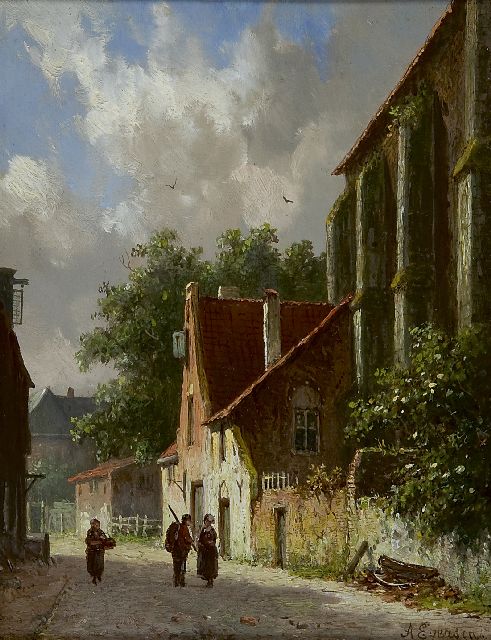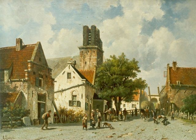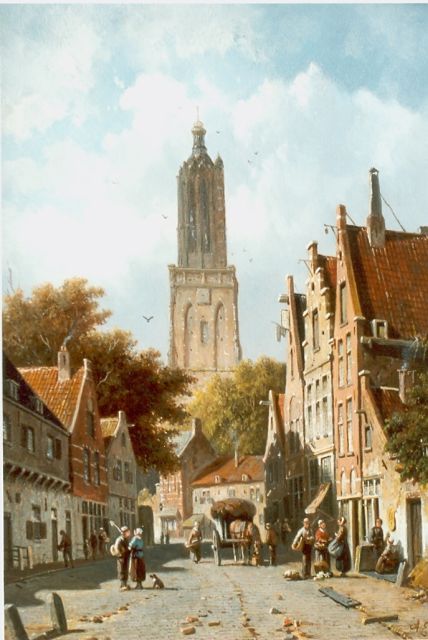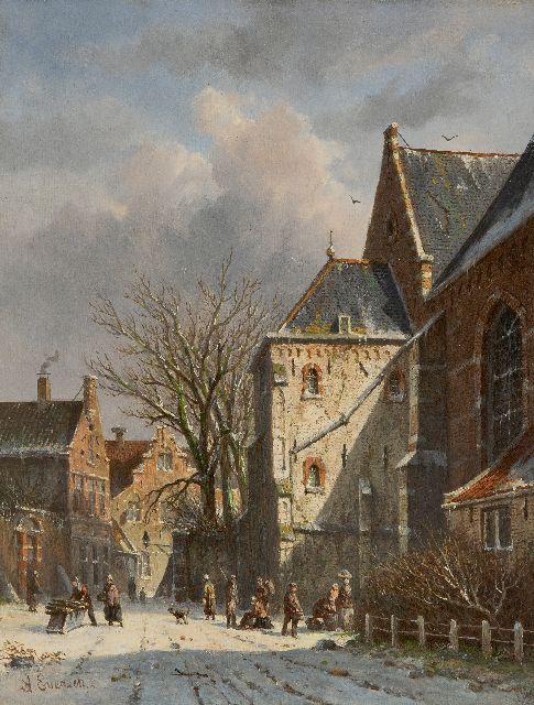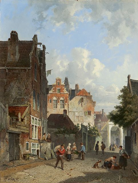 Adrianus Eversen galt als der begabteste Schüler des berühmten Stadtbildmalers Cornelis Springer. Eversen übernahm den kompositorischen Aufbau, die Detaillierung und die warme Farbgebung von seinem Lehrer. Allerdings war er freier in der Wahl der Themen. Während Springer hauptsächlich 'Porträts' bestehender Gebäude und Stadtteile malte, ordnete Eversen seine Dörfer und Straßen meist so an, dass ein schönes Stadtbild entstand.