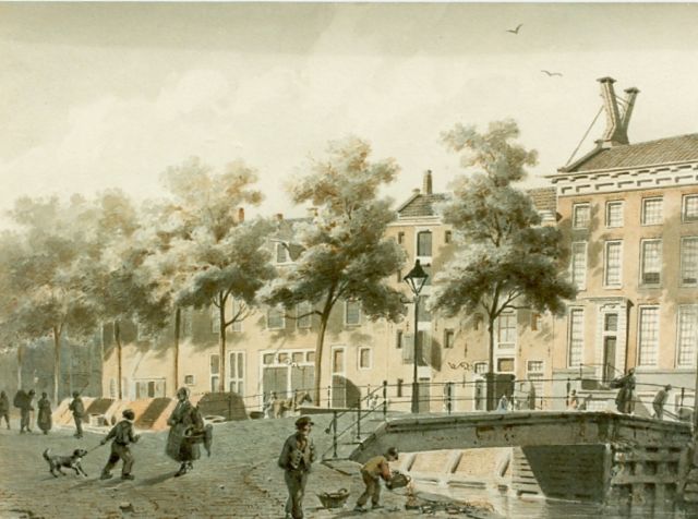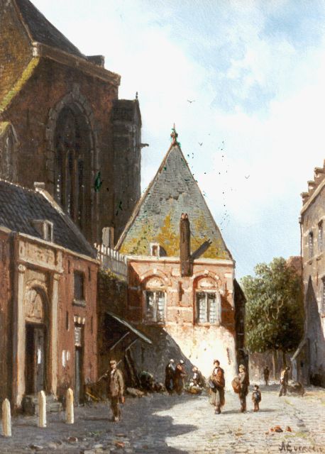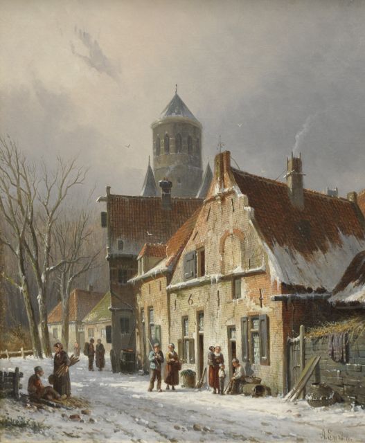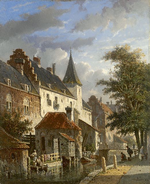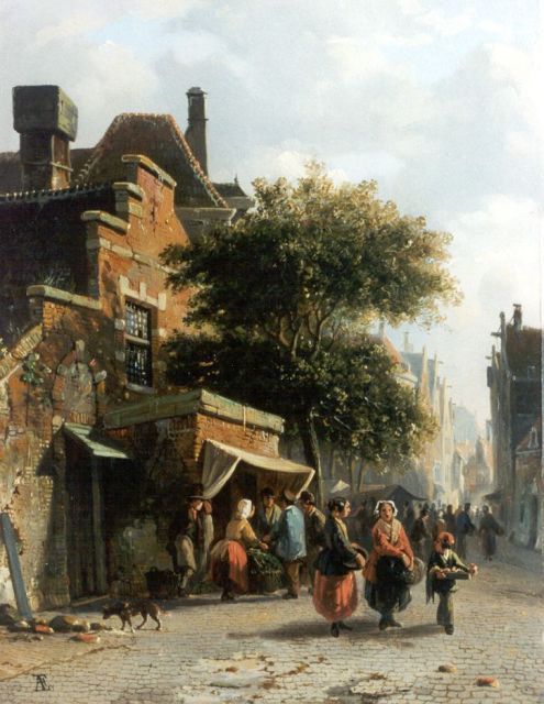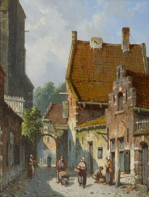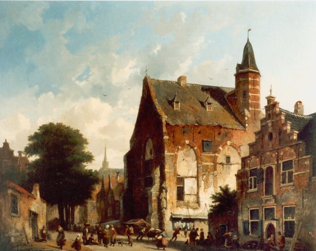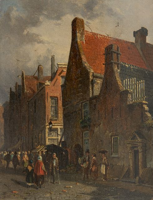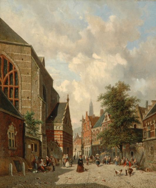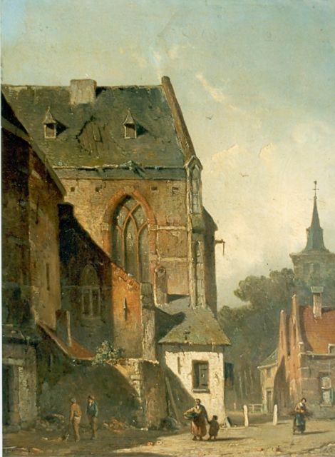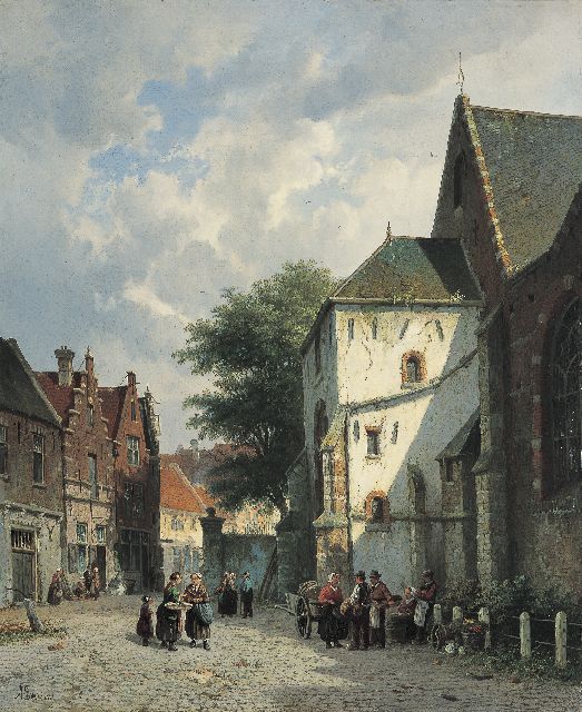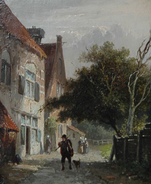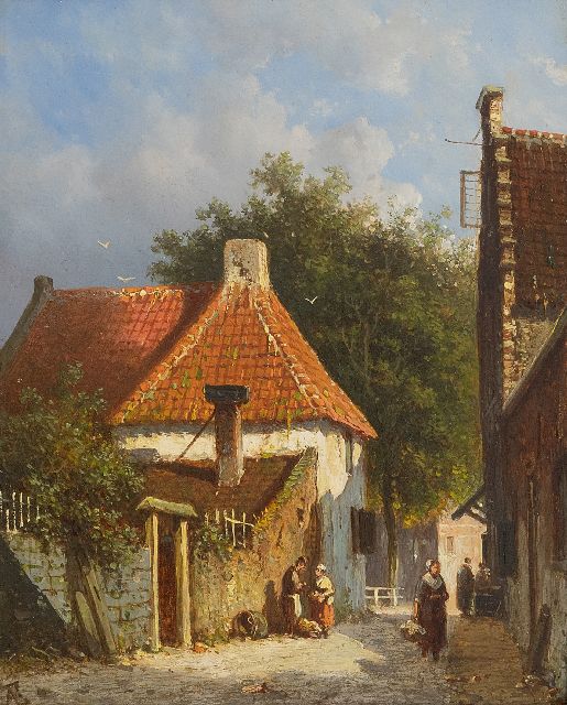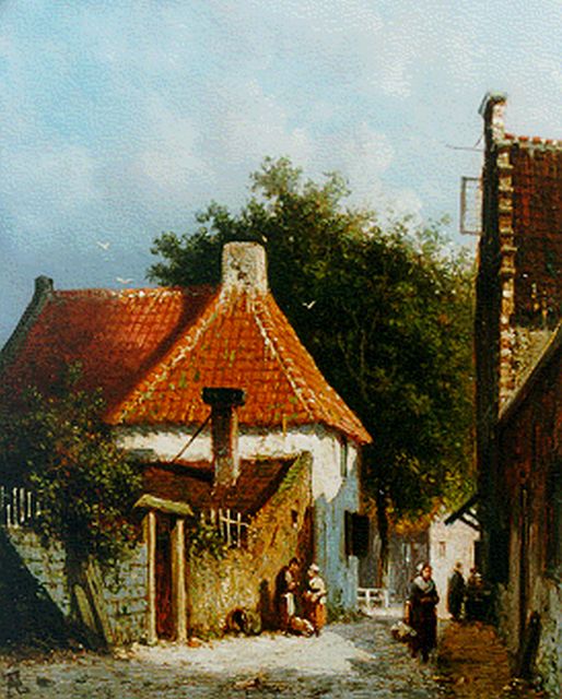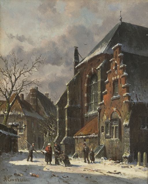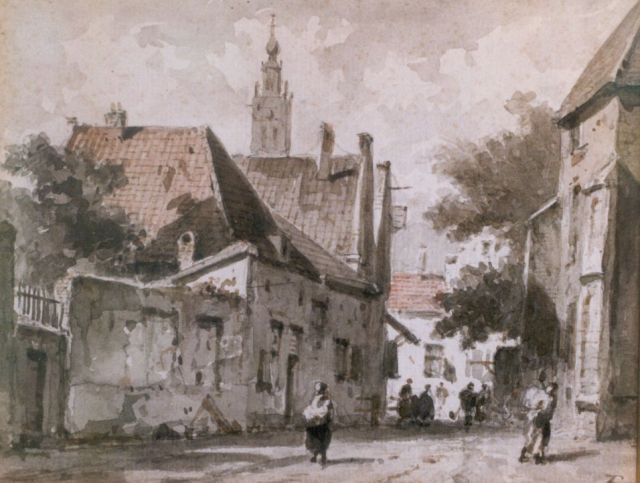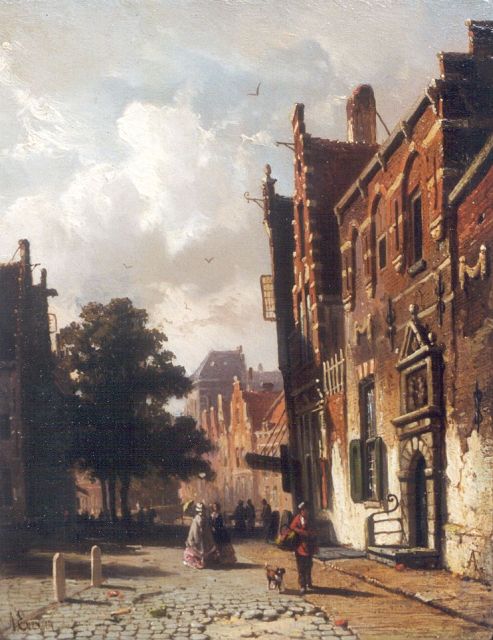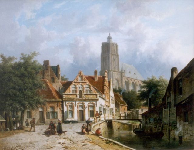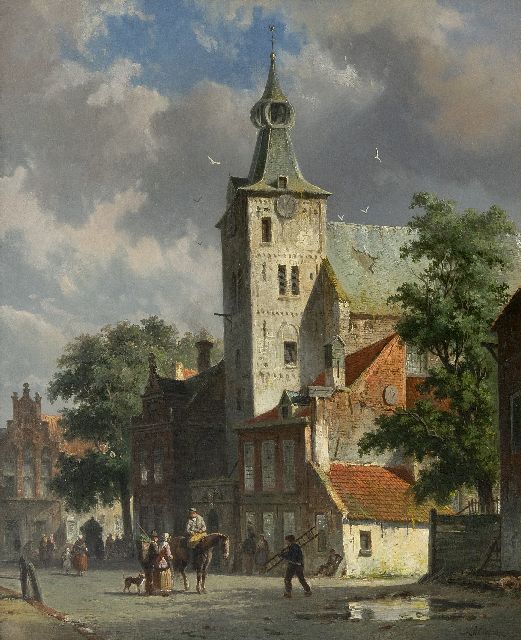 Adrianus Eversen galt als der begabteste Schüler des berühmten Stadtbildmalers Cornelis Springer. Eversen übernahm den kompositorischen Aufbau, die Detaillierung und die warme Farbgebung von seinem Lehrer. Allerdings war er freier in der Wahl der Themen. Während Springer hauptsächlich 'Porträts' bestehender Gebäude und Stadtteile malte, ordnete Eversen seine Dörfer und Straßen meist so an, dass ein schönes Stadtbild entstand.