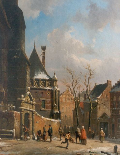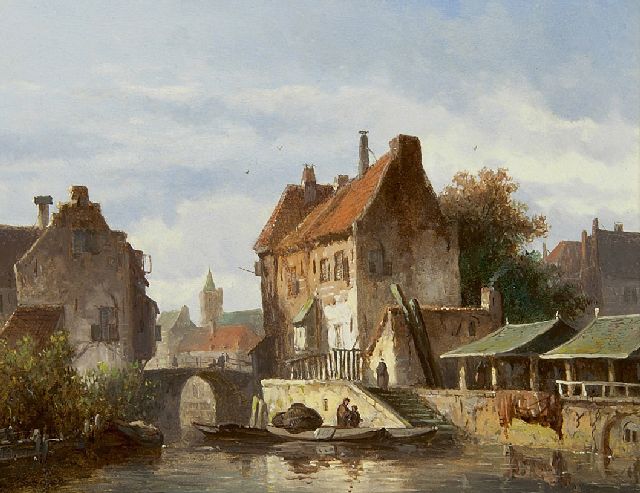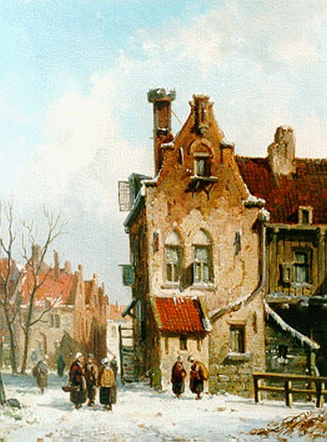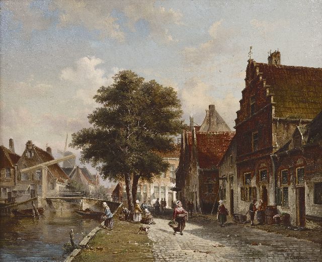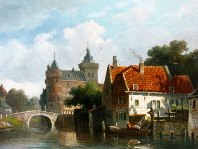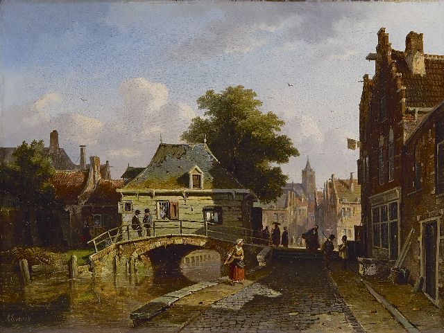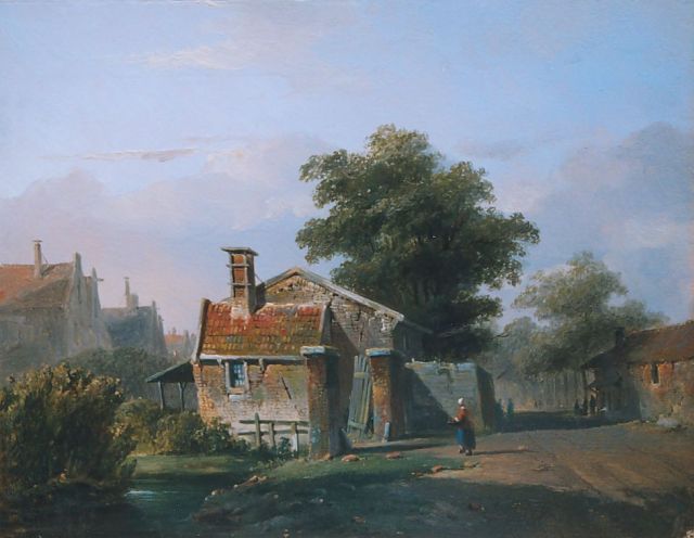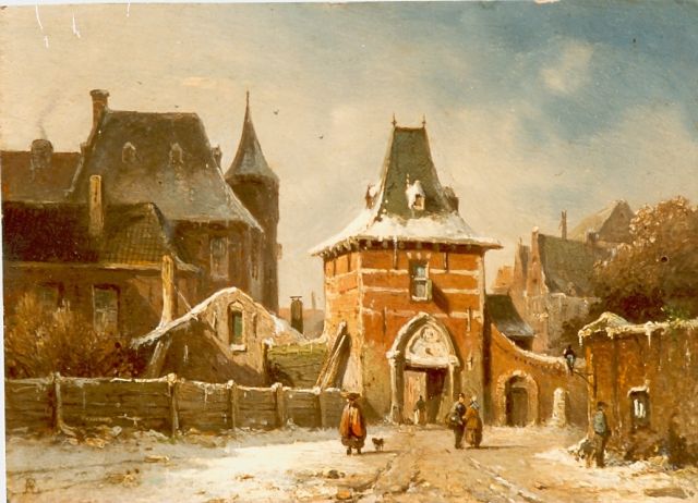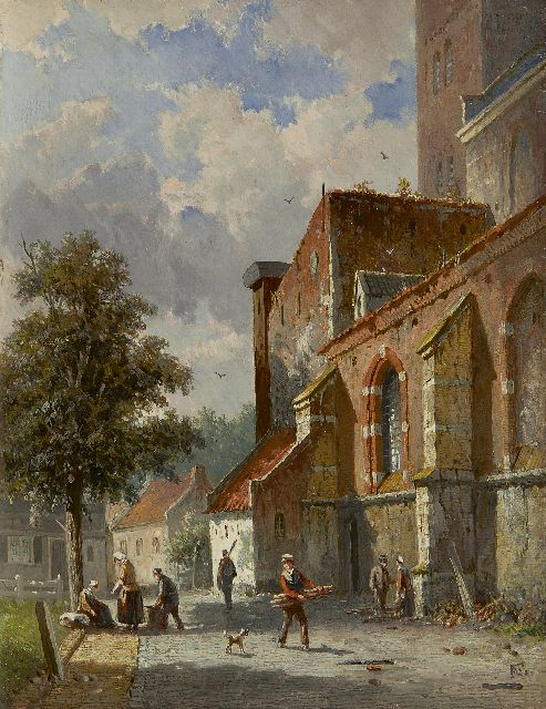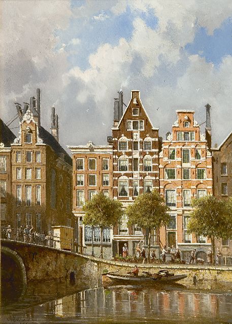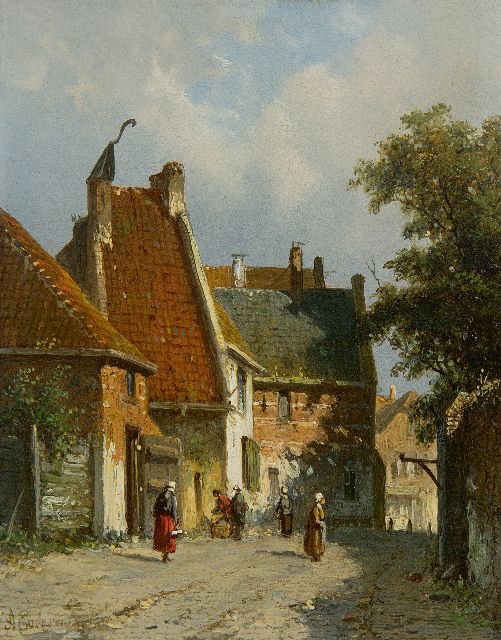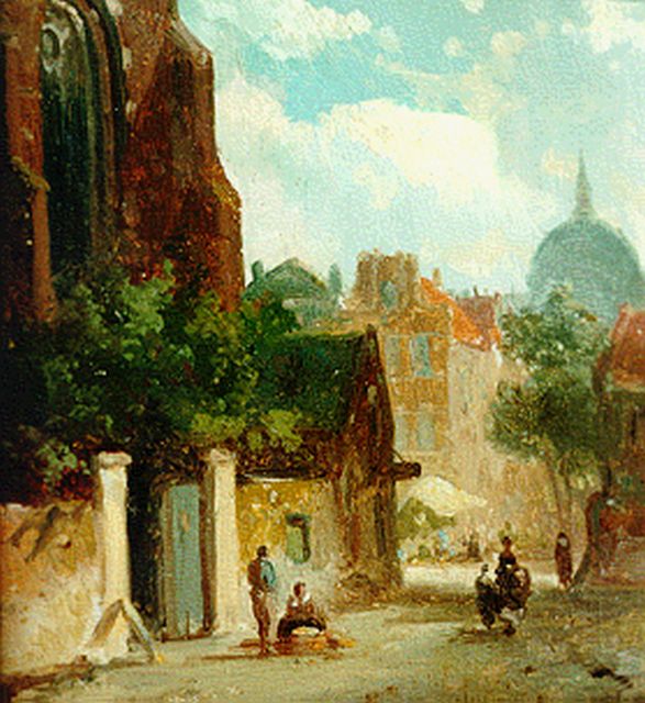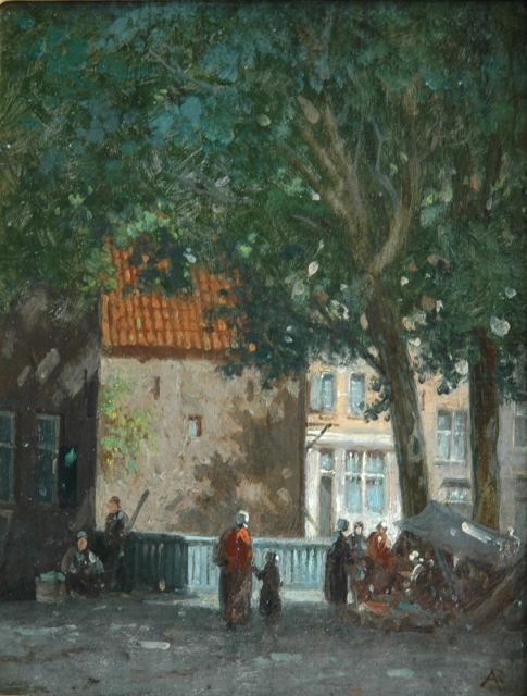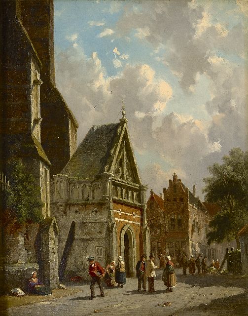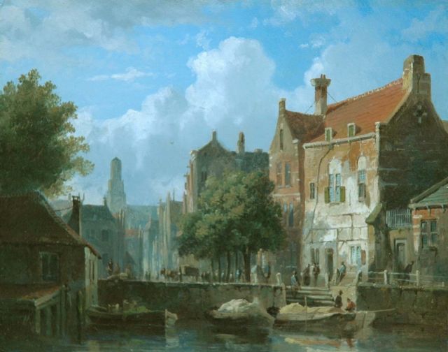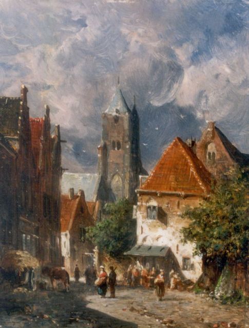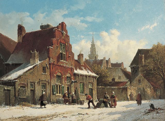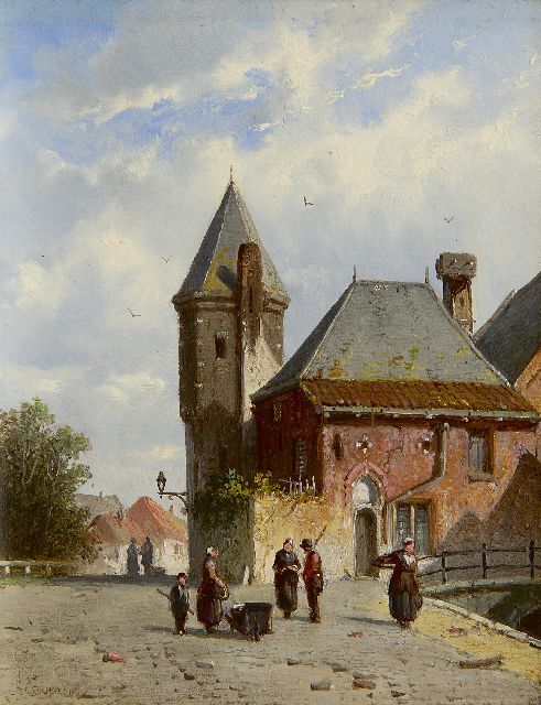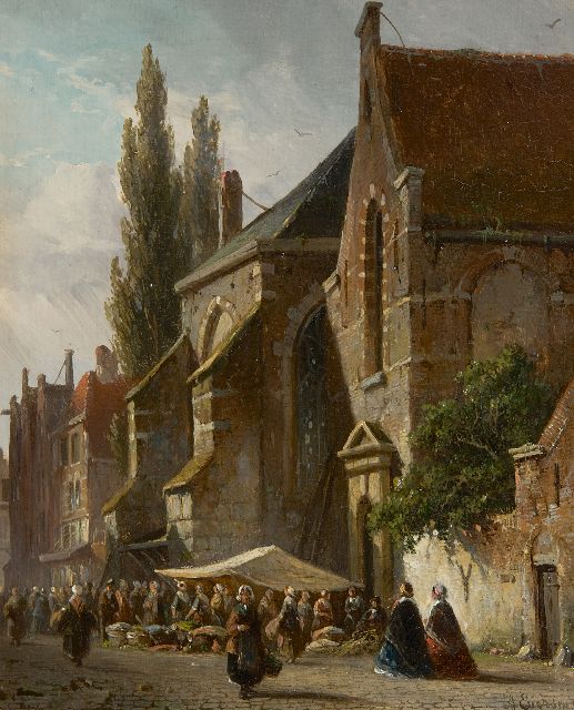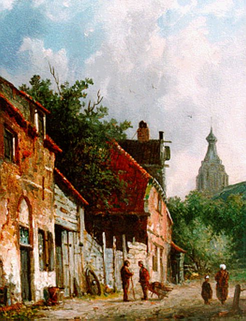 Adrianus Eversen galt als der begabteste Schüler des berühmten Stadtbildmalers Cornelis Springer. Eversen übernahm den kompositorischen Aufbau, die Detaillierung und die warme Farbgebung von seinem Lehrer. Allerdings war er freier in der Wahl der Themen. Während Springer hauptsächlich 'Porträts' bestehender Gebäude und Stadtteile malte, ordnete Eversen seine Dörfer und Straßen meist so an, dass ein schönes Stadtbild entstand.