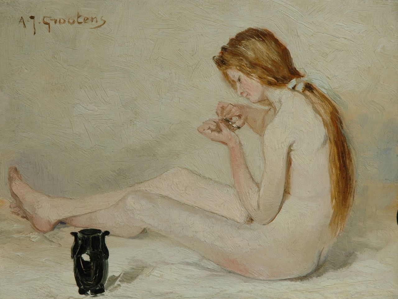 Adrianus Grootens malte und aquarellierte zunächst Landschaften, entwickelte aber bald eine Vorliebe für Porträts und Stillleben. Er lebte und arbeitete in Dordrecht, Buiksloot, Amsterdam, Oegstgeest, Bloemendaal und Bergen op Zoom, wo er im Alter von acht Jahren die Zeichenschule besuchte. Als Maler wurde er durch den Unterricht von Jan Karsenboom und den Rat von Frans Lebret geprägt. Grootens war ein vielseitiger Künstler. Neben seiner Tätigkeit als Maler war er auch ein ausgezeichneter Grafiker und Glaser. Zum Beispiel fertigte er die Buntglasfenster im Bürgersaal des Rathauses in Enschede an. 1901 erteilte er dem Gründer und Herausgeber der Zeitschrift De Stijl, Theo van Doesburg, Malunterricht.