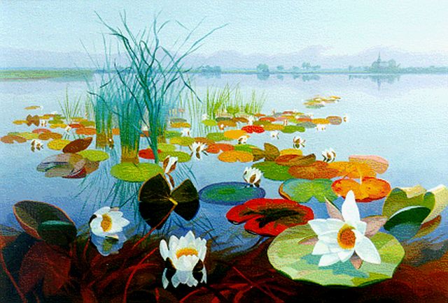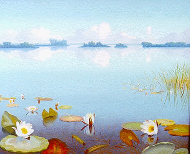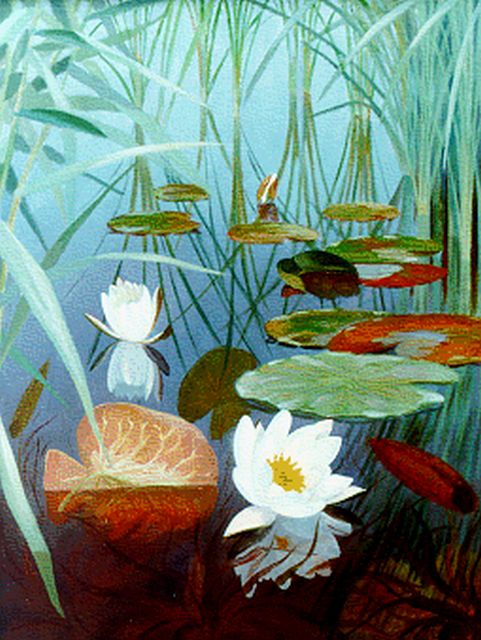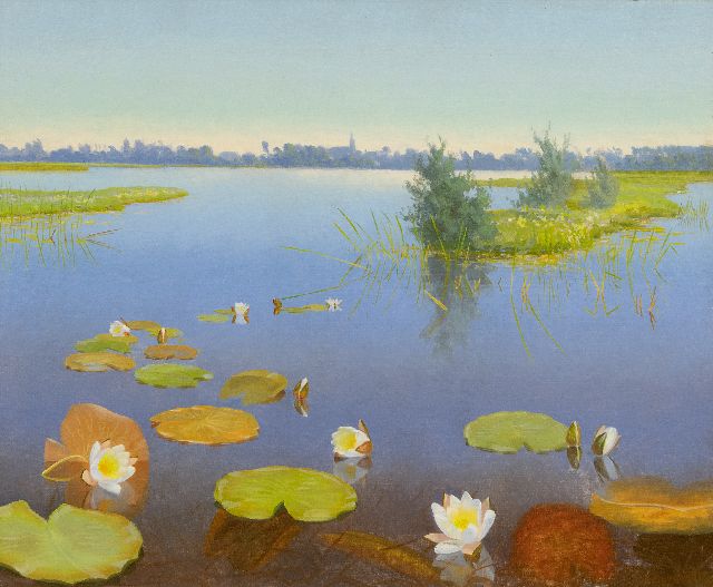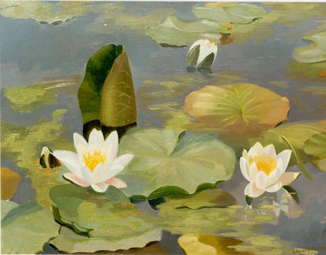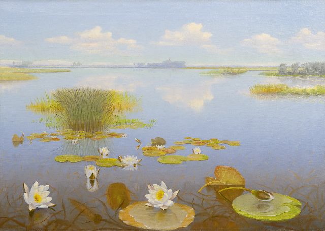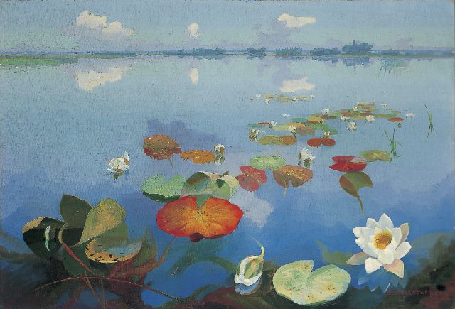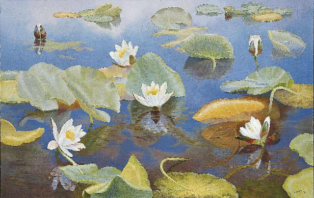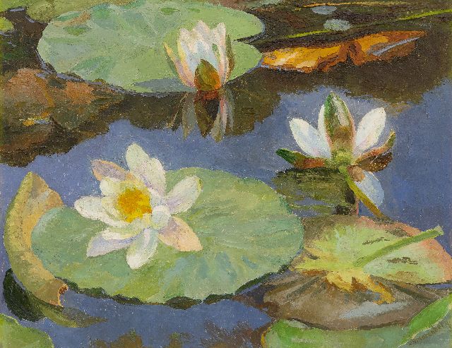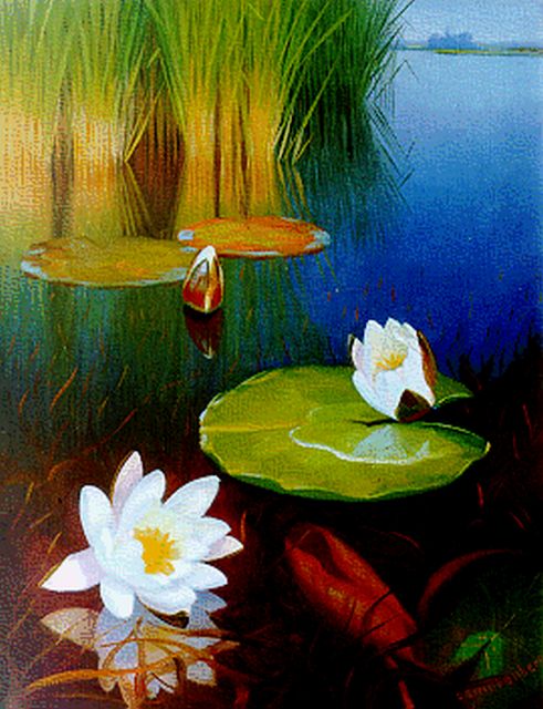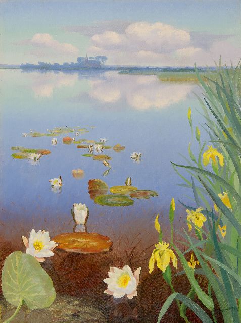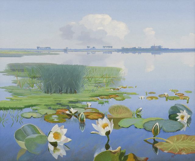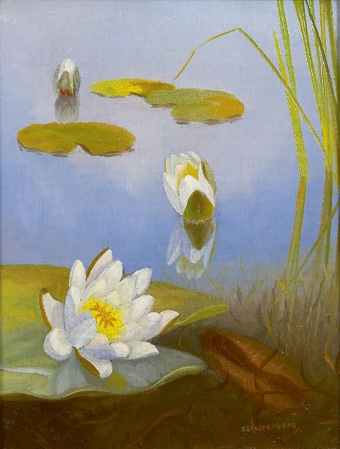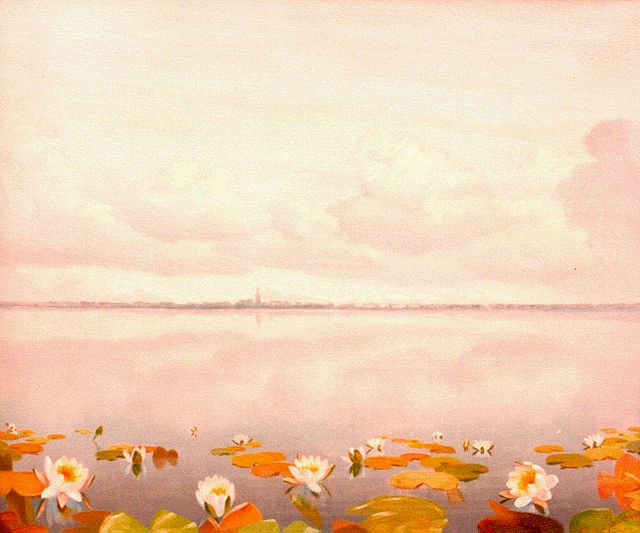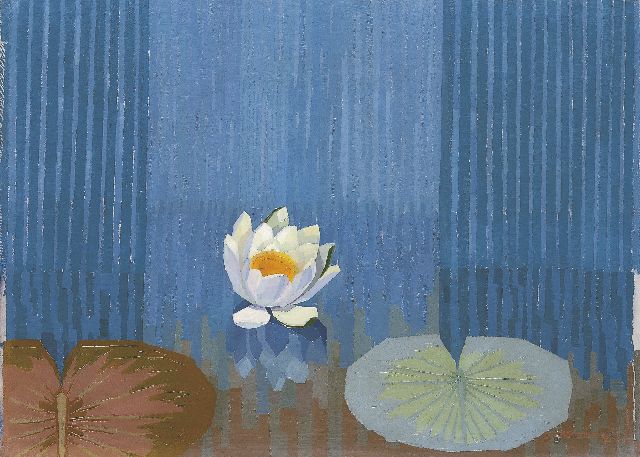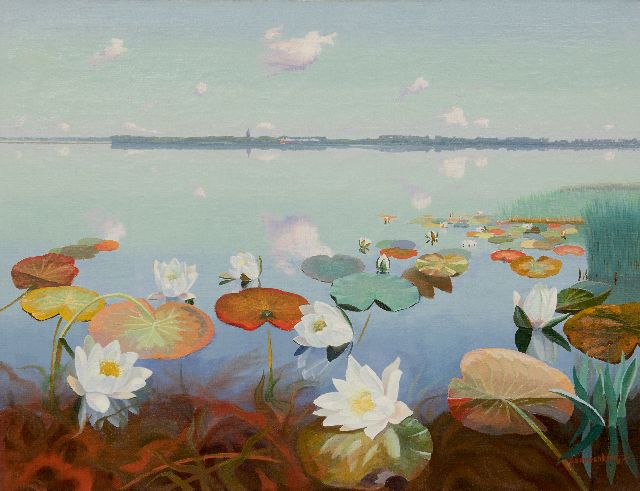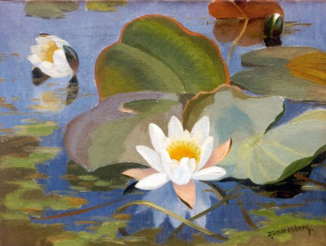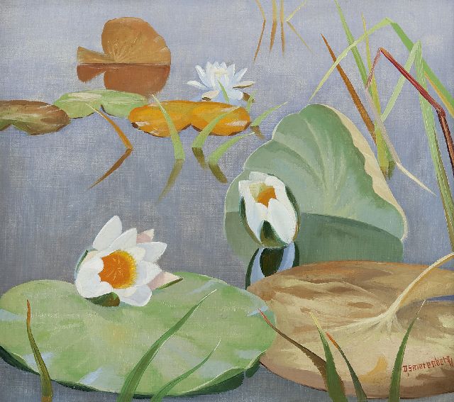 Dirk Smorenberg, geboren 1883, ist einer der wenigen Art-Deco-Maler in den Niederlanden. Seine Darstellung der niederländischen Seerosenseen unterschied sich stark von der der Maler, die dieses Thema zuvor auf die Leinwand gebracht hatten. Die Maler der Haager Schule achteten auf die Stimmung in schnellen Pinselstrichen und grün-braunen Farbtönen, während Smorenberg in seinen Arbeiten um 1910 mit stilisierten Formen, geringer Tiefe und frischen, leuchtenden Farben in den Farben Grün, Blau, Flieder und manchmal Rot experimentierte. Anfangs war sein Werk in der Öffentlichkeit nicht so beliebt, dass es zu flach, taub und ohne Emotionen gemalt wurde. Die Anerkennung entstand jedoch bald, als der Art-Deco-Stil in Mode kam. Smorenberg war ein unabhängiger und origineller Künstler. Für viele seiner Gemälde fertigte er spezielle handgeschnitzte Holzrahmen an. Neben den berühmten Seerosen malte er auch Stillleben, ein einziges Stadtbild und Porträts.