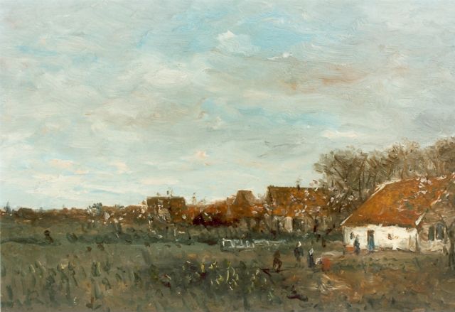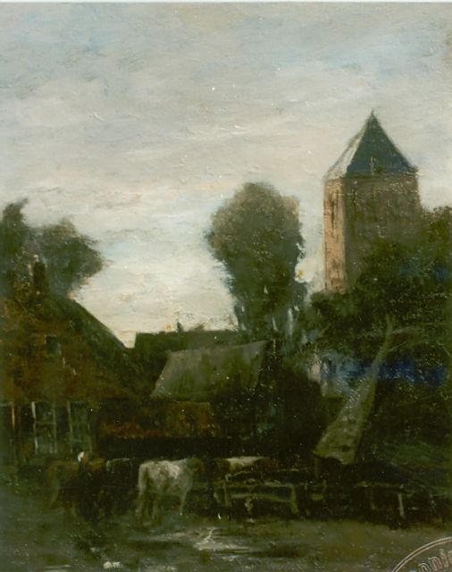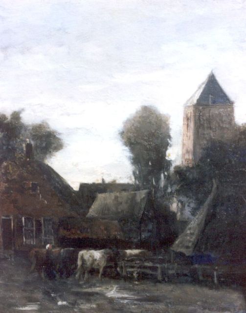 A farmer's wife with cattle, a village beyond