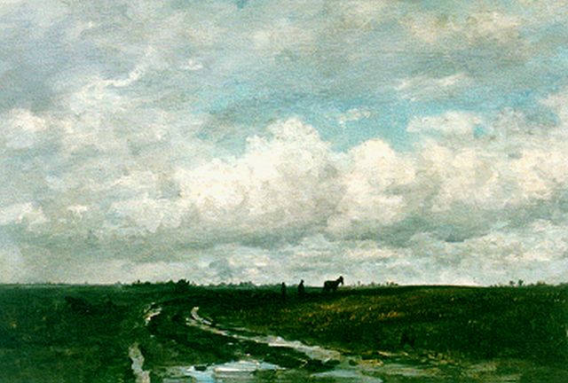 A polder landscape with a ploughing farmer