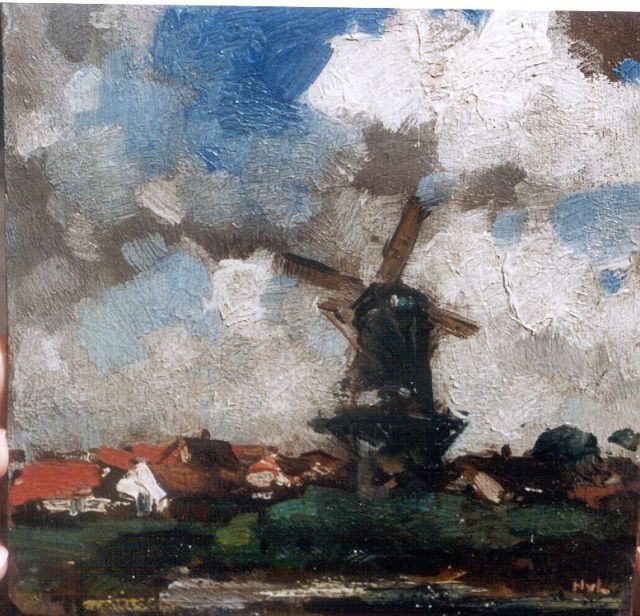 Henk van Leeuwen | Landscape with windmill, Öl auf Holz, 14,2 x 14,0 cm, signed l.r. with initials